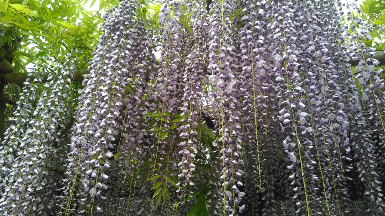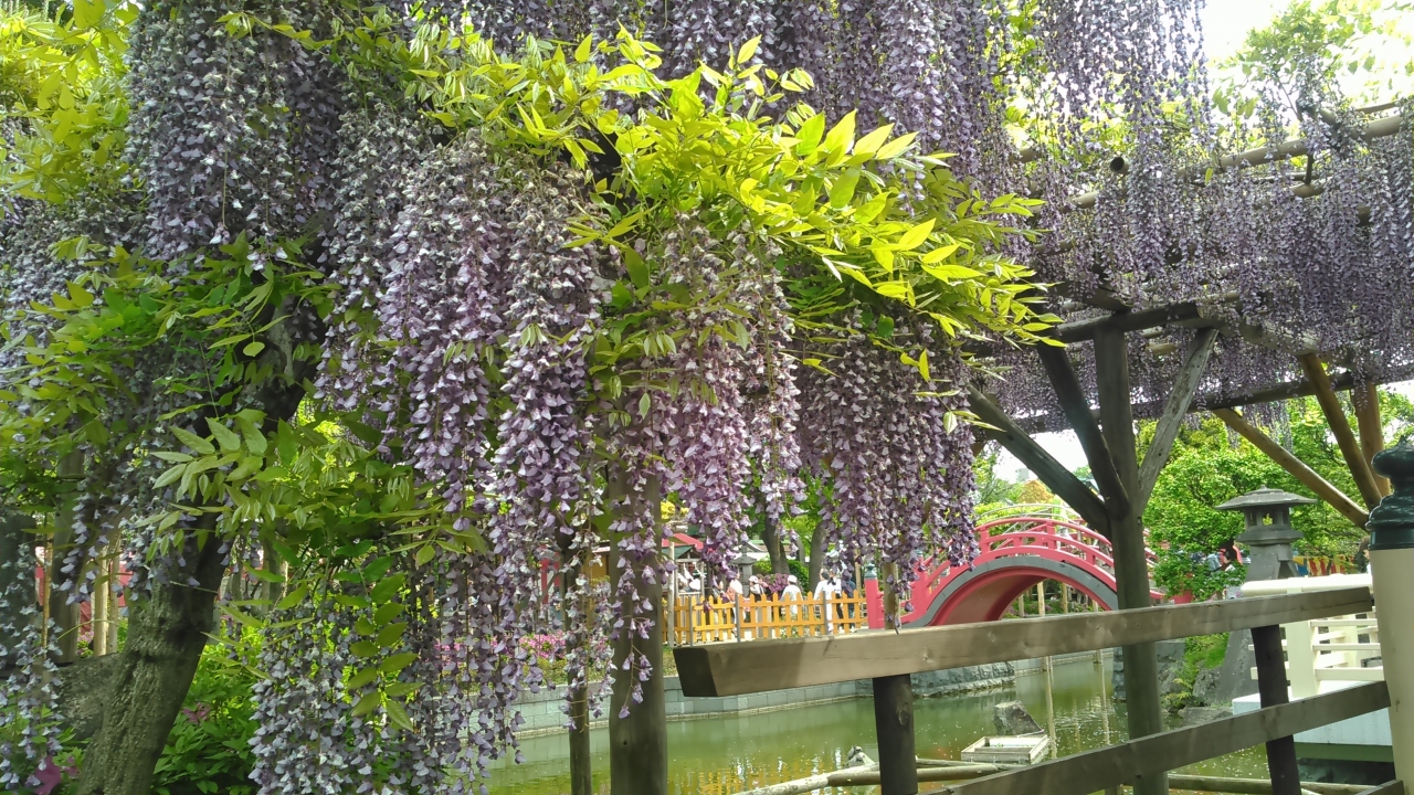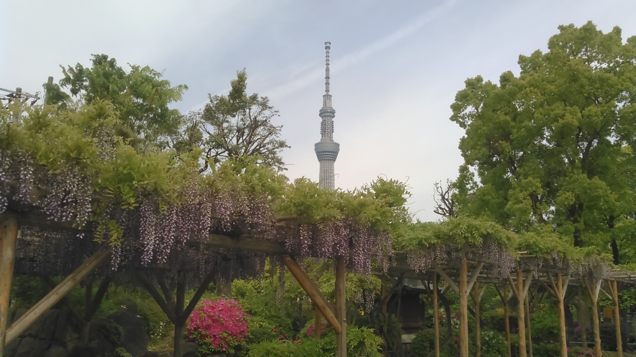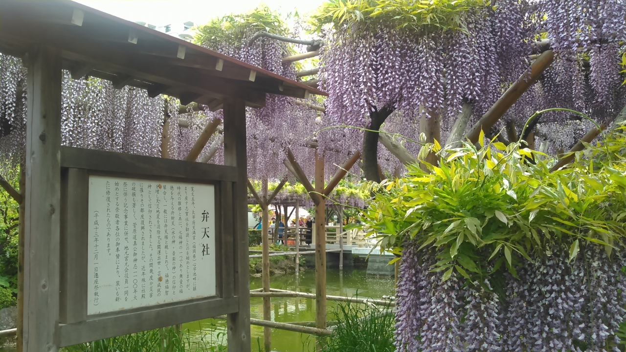 日帰りバスツアーで訪問しました。朝9時頃着きましたが、もう、大勢の方が見頃の藤の写真を撮っていました。周りには屋台が沢山出ていました。藤は本殿に向かって左側が沢山咲いています。スカイツリーも撮ろうと思ったら、右側から撮ることをお勧めします。赤い太鼓橋とスカイツリーと藤が撮れます。