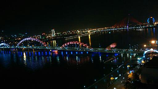 ダナンへの行き来の度に通りました。龍が水面を泳ぐ様をデザインした橋です。夜はライトアップされていて美しいです。宿泊したホテルの部屋が、この橋に向いていたので、部屋からの眺めも楽しみました。土日の21時前後から、龍の口から水や火を吐く演出もあるそうです。