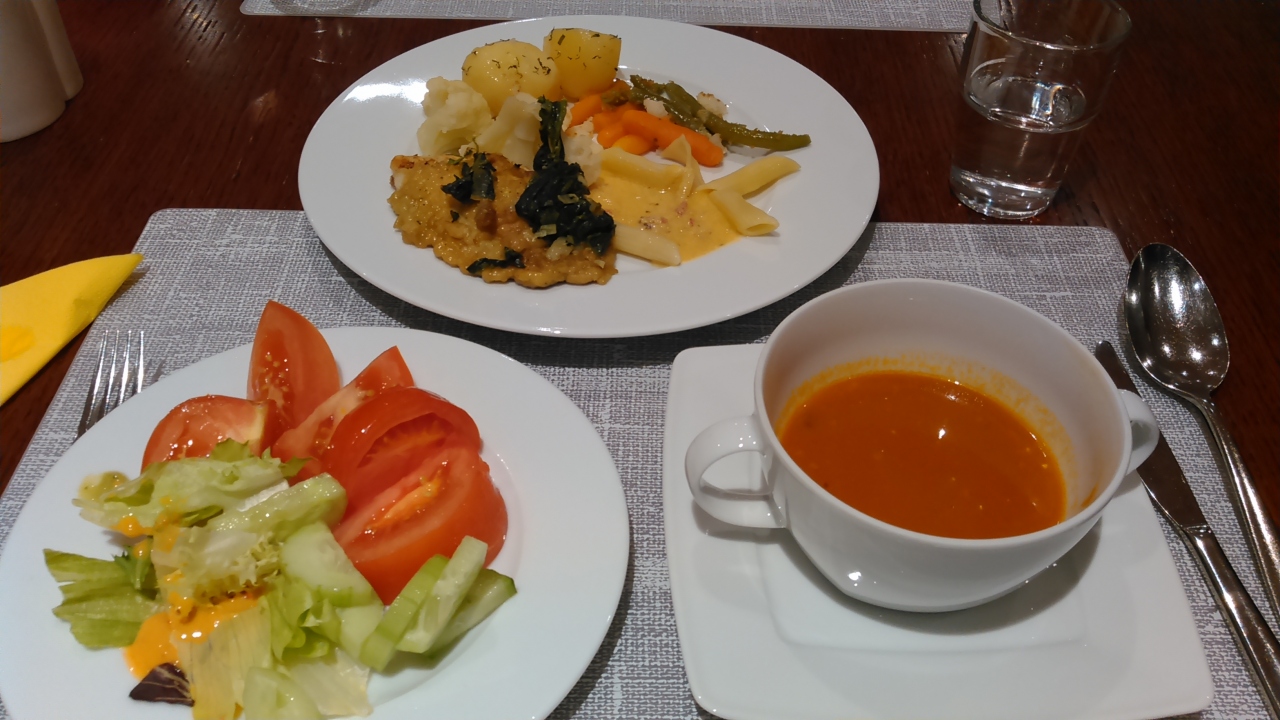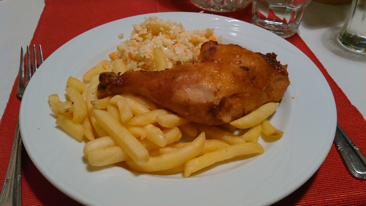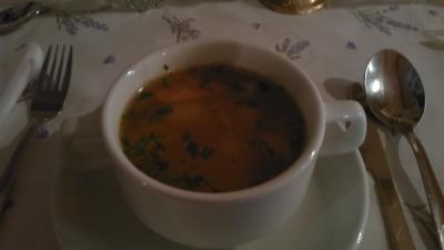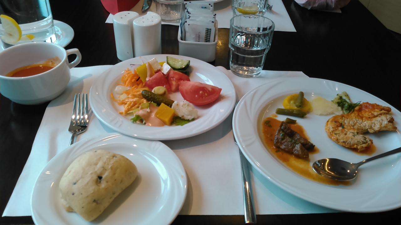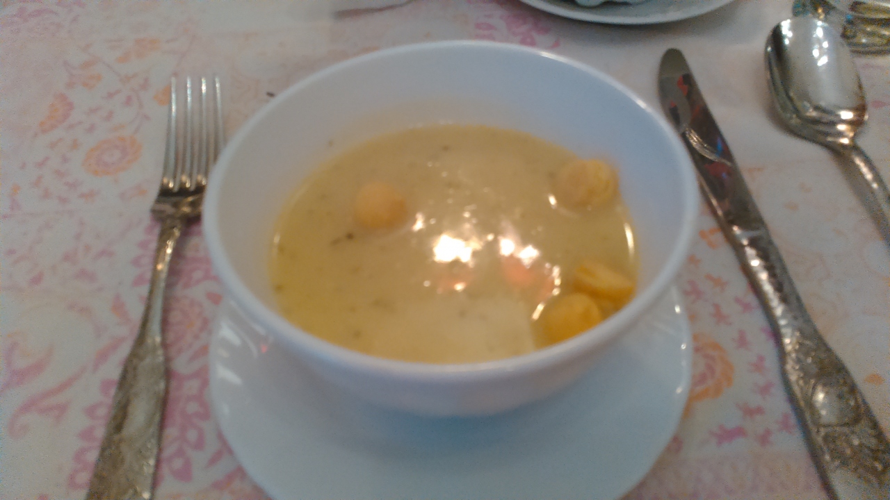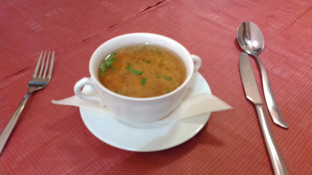 ツアーの夕食で訪問しました。旧市街の広場のそばで、便利な所にあります。前菜はボルシチ、赤カブのスープです。甘かったです。メインはチキンのグリルとフライドポテト、