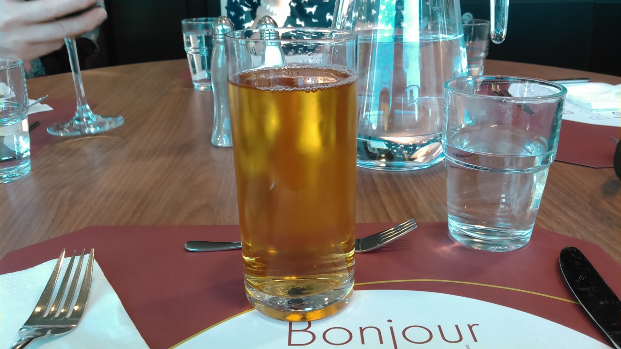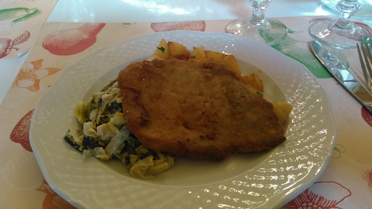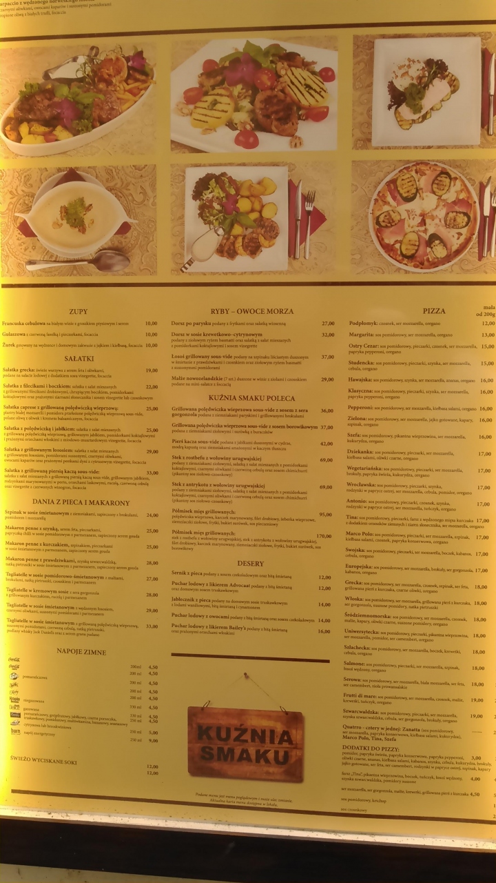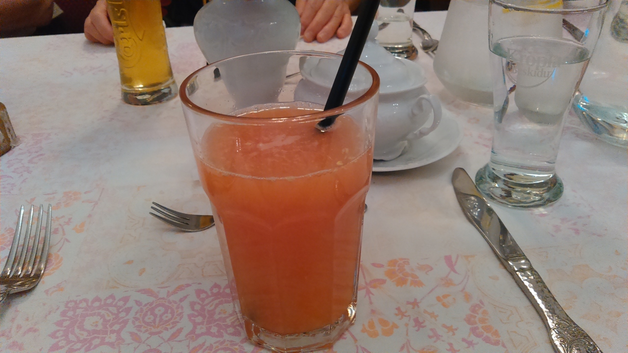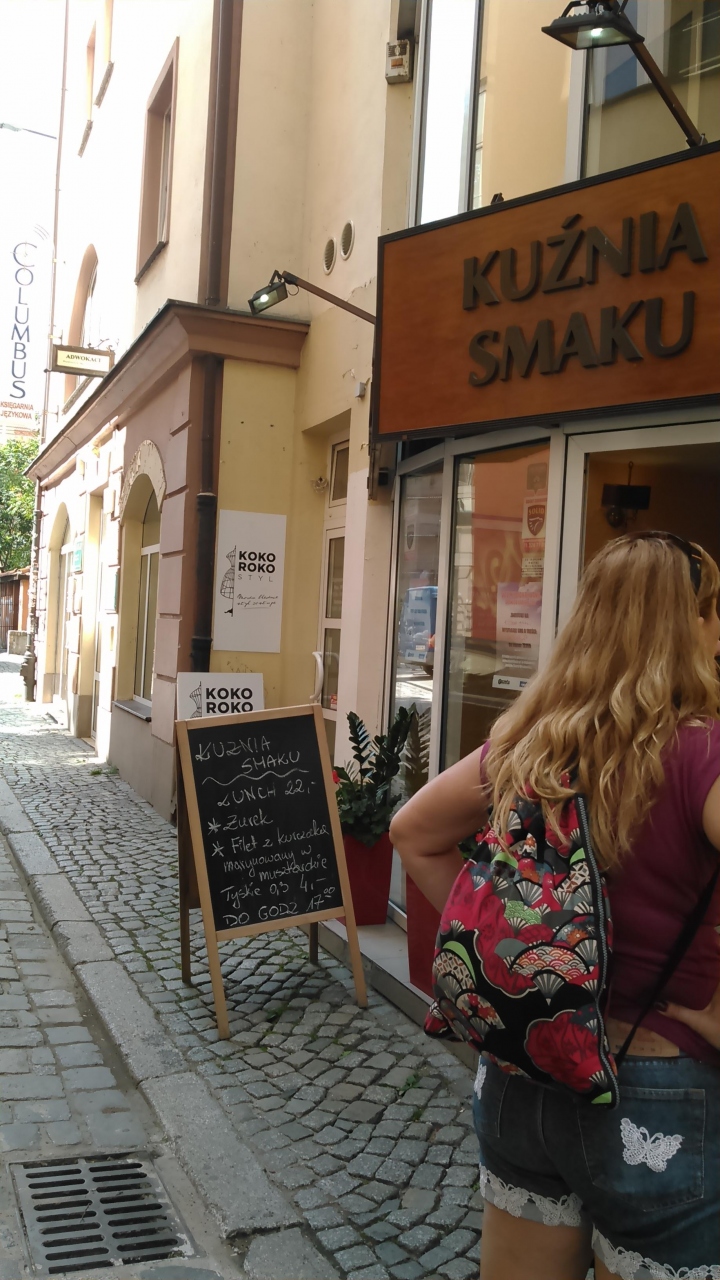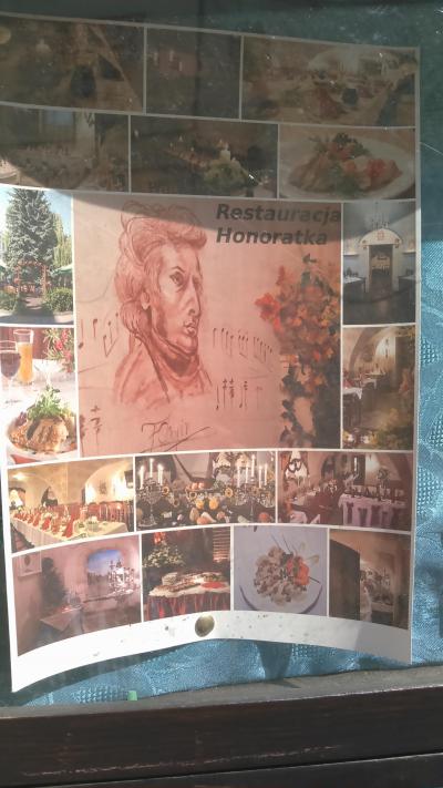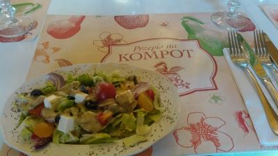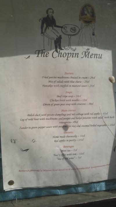 ツアーでショパンの生家に行き、その後ランチに行きました。道路を渡って目の前にあります。メニューはギリシアサラダと、ポークカツレツ。前者は美味しかったですが、後者は塩辛かったです。飲み物はここの名前の付いた「コンポットジュース」色は透き通った赤で美しかったですが、砂糖水を薄めた味で、10ズロチ、失敗でした。