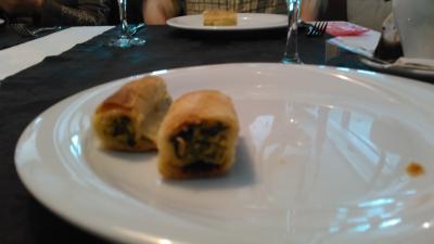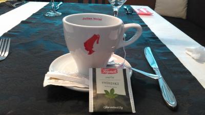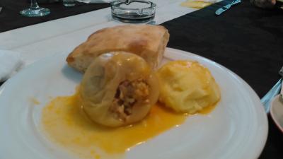 ツアーで訪問しました。事前にチェバプチチか、パプリカのハンバーグ詰めを選択し私は前者を。後者を頼んだ人とは、半分こしてそれぞれ食べてみましたが、私には自分の方が美味しく感じました。前菜はパイ2切れ。中身はお好み焼の具のような物。パイ生地がなかなかナイフで切れませんでした。紅茶は1.5ユーロ。デザートはチョコムース。これは美味しかったです。予約していた割に、サーブに非常に時間がかかりました。