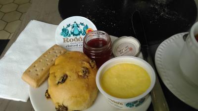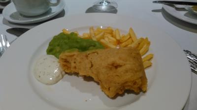 ツアーのランチに訪問しました。メインはイギリス名物のフィッシュアンドチップス。衣が大きかったですが、中のタラは小さかったので、十分食べられました。前菜はサラダ、デザートはフルーツ。サラダ、紅茶は2,5ポンドでした