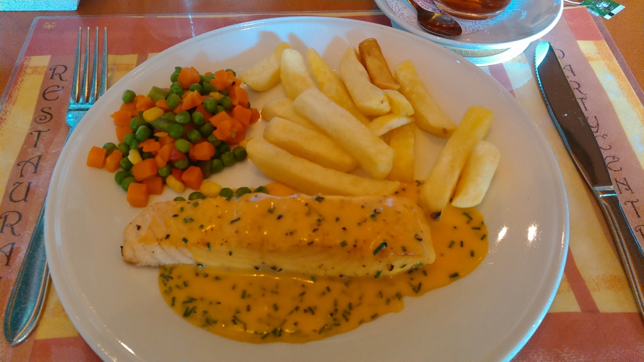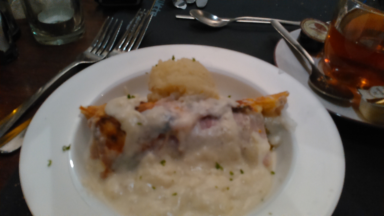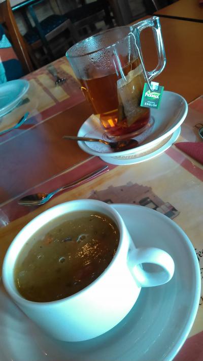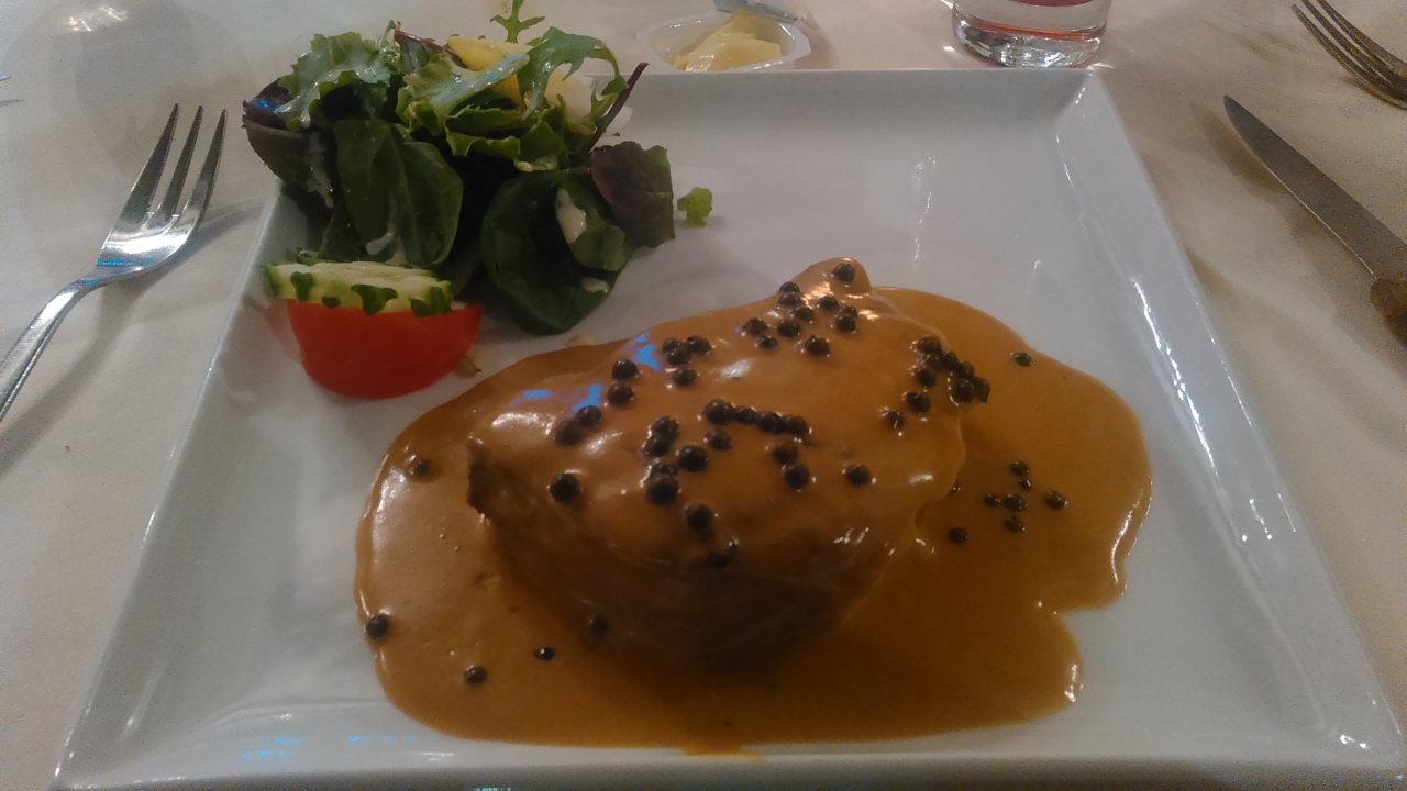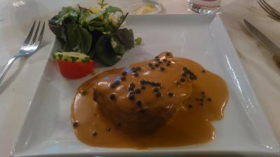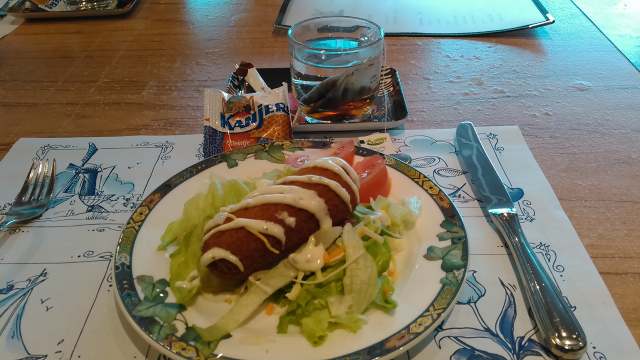 ツアーのディナーで利用しました。オランダでの最終ディナーです。ヒュッツポットというオランダの名物料理を食べました。巨大な肉団子のことです。味は香辛料をたっぷり使い過ぎている感じで、大きすぎて残しました。芯まで火を通すには、多分オーブンでじっくり焼くのでしょう。紅茶は2.2ユーロでした。