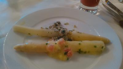 ツアーの自由食ディナーの際に、添乗員さんに勧められて6人で訪問しました。季節の物ということで「ホワイトアスパラ」2皿(1皿23ユーロ)を皆でシェア。他に私は一人で牛フィレステーキ(30ユーロ)、他の方はラム、サーロインをそれぞれ注文し2人ずつで分けました。皆でそれぞれ一口ずつ食べました。アスパラもフィレもラムも柔らかく美味しかったです。