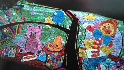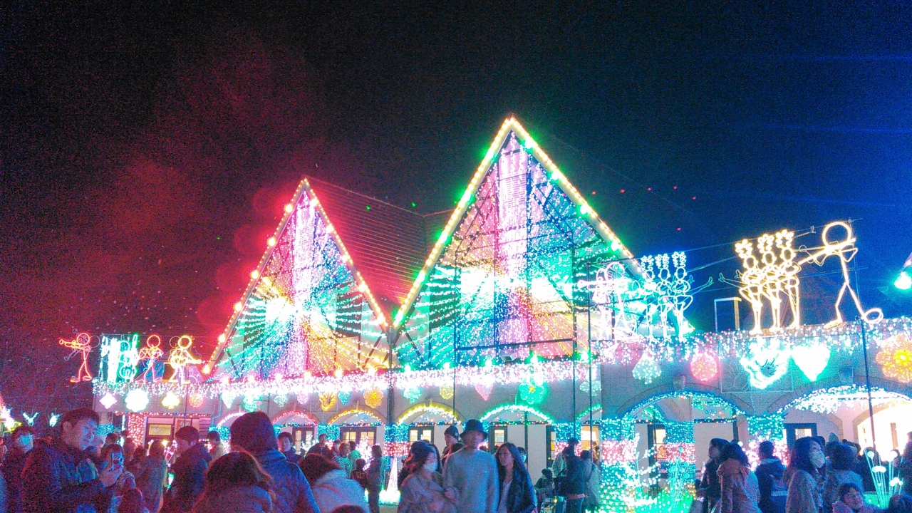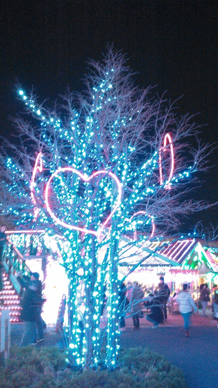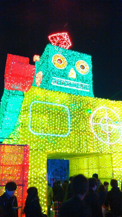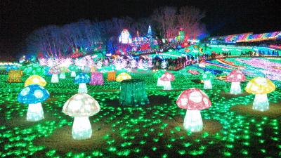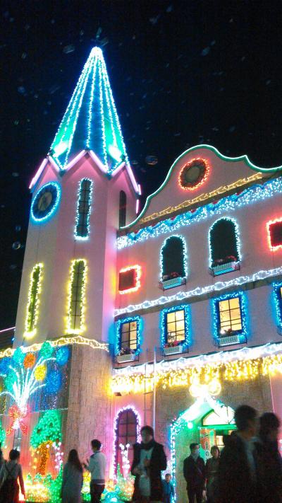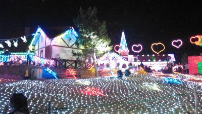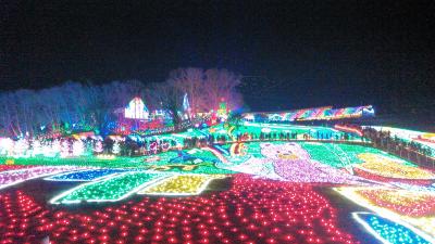 イルミネーションというと冬の物というイメージですが、ここは3月31日まで行われています。もとは、ゴルフ場にする予定だったとかで、土地の作りが、傾斜地となっています。今年のテーマは「おもちゃ箱」。見晴らし台からや、500円払って60分並んで乗る観覧車からも、全景が良く見えます。光と音のショーで、出て来るシャボン玉つぶしを