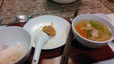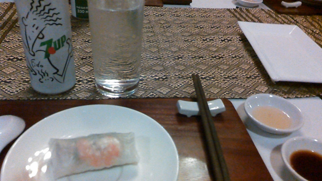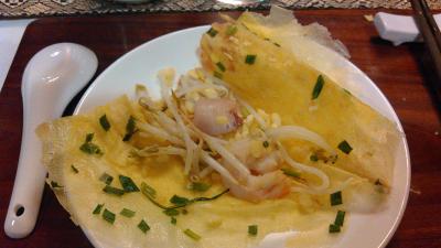 ツアー初日の初ベトナム料理でした。ベトナム料理は美味しい、日本人の口に合うと聞いていましたので、期待していました。「バインセオ」というベトナムのお好み焼きが美味しかったです。クレープのように薄い生地の中に豚肉、モヤシ、エビがくるまれて入っており、今後の料理にも期待が持てました。