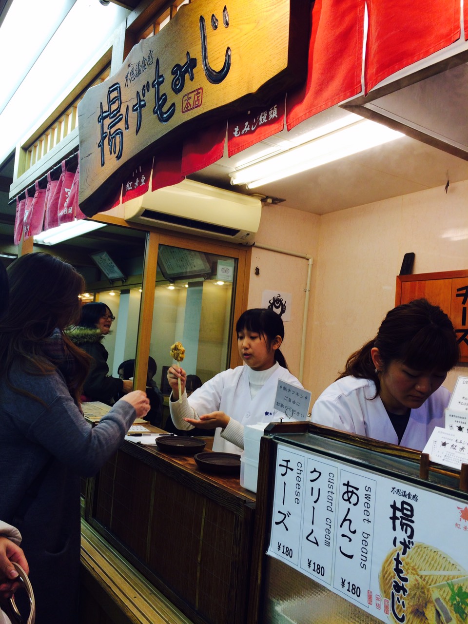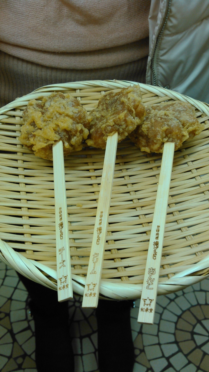 揚げたてのもみじ饅頭が、その場で食べられます。串にささった揚げ饅頭をざるに乗せてくれ、奥のひもうせんの所に座って、セルフでお茶を飲みながら、いただくことができます。餡・クリーム・チーズの中での私のお勧めはオーソドックスですが、餡でした。