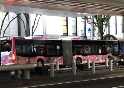可愛いピンク色のバスです。福岡市のは黄色だったような?北九州市でも連結バスが走っています。昔の電車通りを走っているのはよく見かけますが、平和通りでも走っています。が、長いので、追い越す車には気を付けてほしいと思いました。