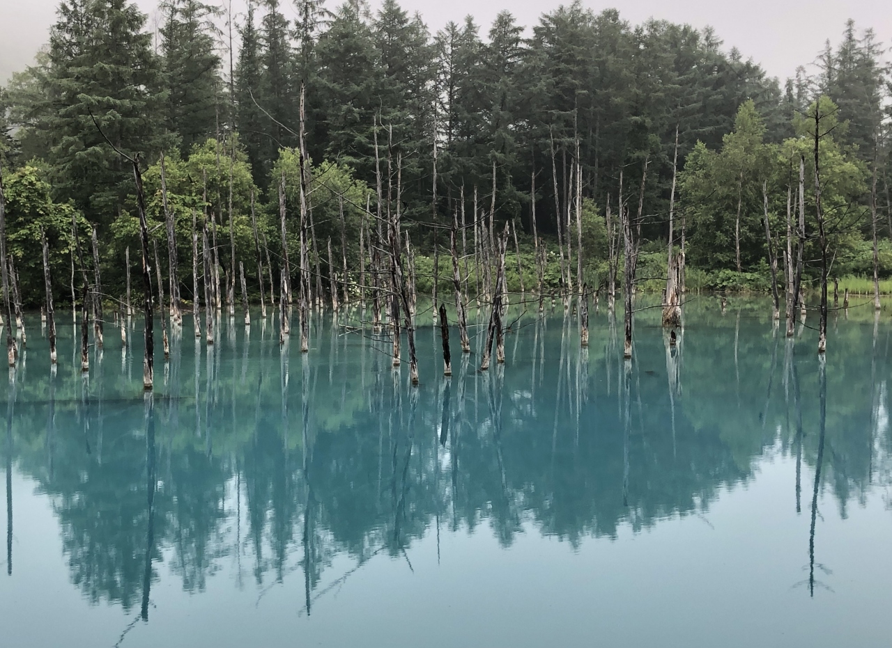 先月に続き、今月も雨の中、ツアーで行きました。バスガイドさんは、暗黙の了解のはずの一方通行の坂道を逆歩し、それに続きます。階段よりは膝に優しい。ピンポイントで、池と立ち枯れている木を眺めました。相変わらず美しい青でした。
