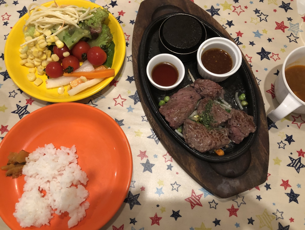 娘二人と、平日お昼に訪問しました。斜め向かいの駐車場は、5台ほどで満車。仕方がないので徒歩5分のイトーヨーカドーに止めました。店の裏に有料駐車場があることを、退店するとき知りました。レディースステーキランチと、ハンバーグを頂きました。お肉が柔らかく美味。ライス、ガーリックライス、牛骨スープ、サラダ、飲み物、ワッフル、生フルーツ、一口コーヒーゼリーなど、すべてセルフで食べ放題です。お腹いっぱい頂きました。