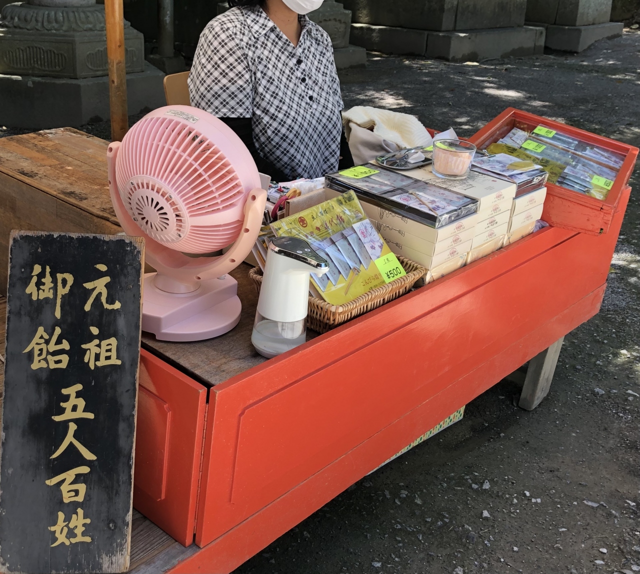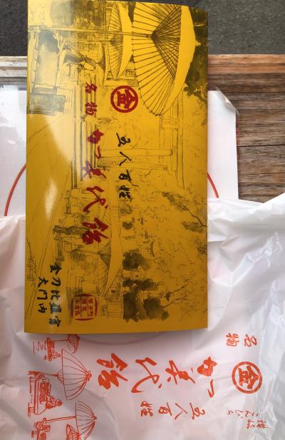 大門を入ってすぐの所に、大きな和傘を開いて、露店を開いています。金毘羅名物の加美代飴を売っています。境内での販売を特別に許可されています。5枚入り500円の、黄金の飴です。小さな小槌で割って食べます。行きに一口頂いて元気をもらったので、帰りに購入しました。