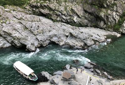 ツアーでレストラン「まんなか」に観光バスを駐車し、どんどん階段を下りて行きました。吉野川のほとりまで下りたところに遊覧船の船着き場があります。途中の駐車場からでも、吉野川、奇岩、断崖絶壁、遊覧船などは見ることができます。絶景です。