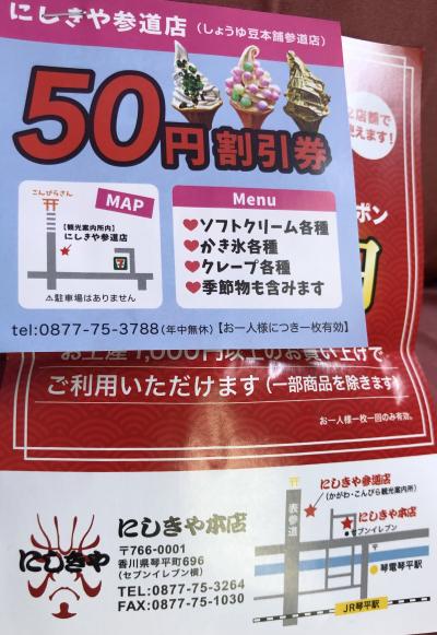 セブンイレブンの隣にあるレストラン兼みやげ物店です。観光バス駐車場になっています。参拝の帰りここでソフトクリームを食べたり、お土産を買ったりするよう、50円割引券もくれました。軽食もあるので、添乗員さんはうどんを召し上がっていました。