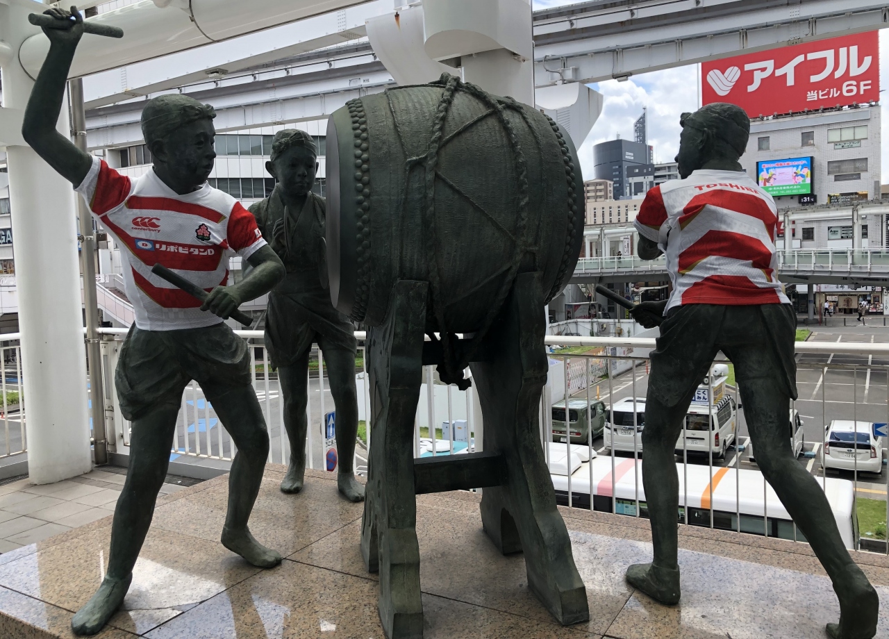 小倉駅からペデストリアンデッキを通ってセントシティーへ行く途中にある、3人の子供が太鼓を叩いている像です。今月は、なんと、二人がTシャツを着ていました。6月25日(土)にラグビーの試合がミクニスタジアムであるとのことで。7月には3年ぶりのお祭りが開催されるそうで、あちこちから練習する太鼓の音が聞こえていることでしょう。心なしか、微笑んでいるようにも見えました。