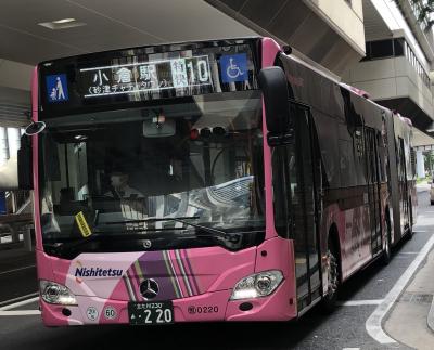 福岡市だけでなく、北九州市でも連結バスが走っています。昔の電車通りを走っているのはよく見かけますが、平和通りを走っているのを初めて見かけました。ピンク色で可愛いですが、長いので、右折が難しいのではないかと思いました。