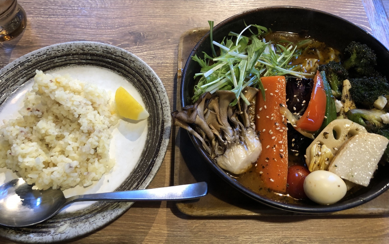 トマムに宿泊し、早めの夕食にホタルストリートのここを訪問しました。スープカレーのお店です。15種類の野菜のスープカレーがライス付きで1750円。トッピングが150円で、私は揚げブロッコリー。友達はチーズ。ラッシーが500円。どれも美味しかったです。