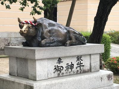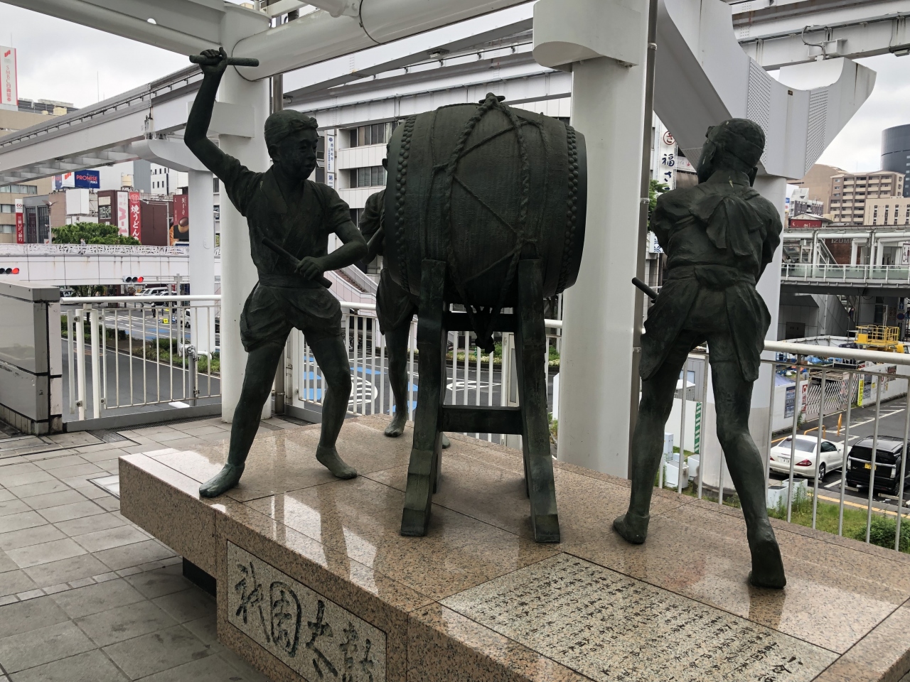 小倉駅からセントシティに向かうペデストリアンデッキ上にあります。3人の子供が、太鼓をを叩いている像です。毎年夏の夕方になると、子供たちが太鼓を練習する音が聞こえてきます。今年は3年ぶりにお祭りをするそうです。本物が見られます。