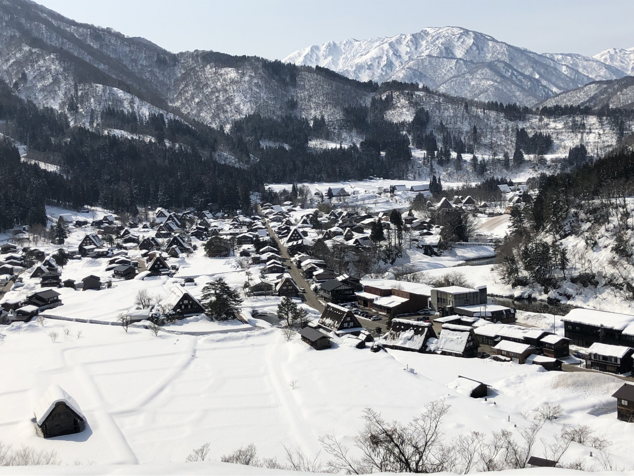 ツアーで訪問しました。良く晴れて暖か、でも辺りは銀世界、雪の中。お散歩日和で、日本の現風景を眺めながら、汗をかきながら、休憩しながら、駐車場から30分、展望台まで登りました。見下ろすと、雪の中にすっぽりと埋もれた合掌造りの家々。この前来たのは秋だったかな?雪の中の眺めも素敵でした。