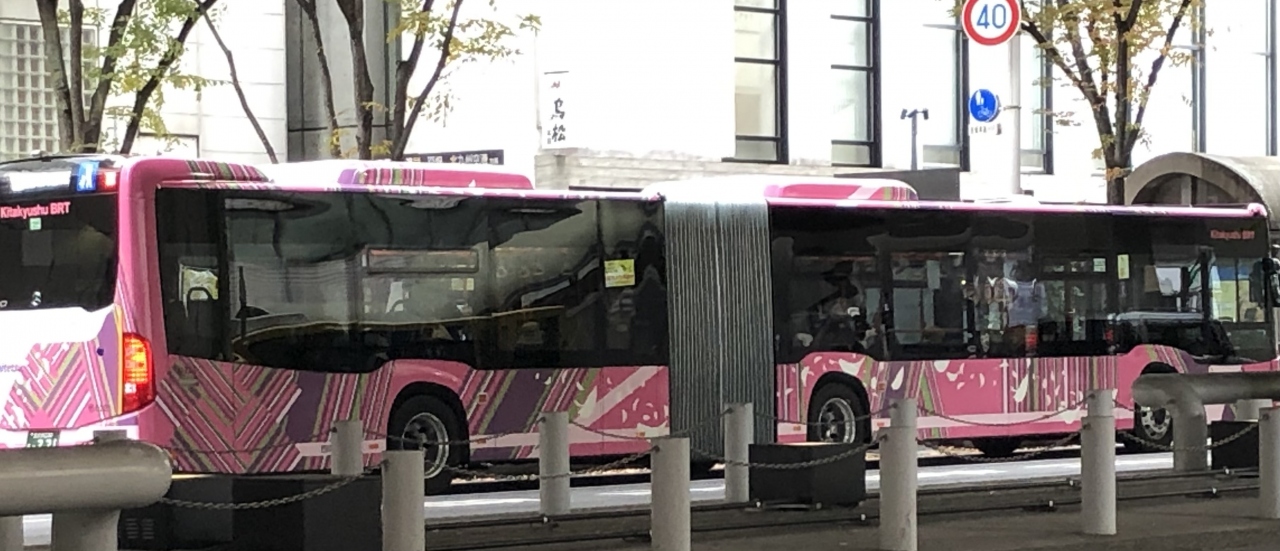 福岡市では黄色の連結バスが走っています。快速バスで各駅停車はしません。北九州市でも連結バスが走っています。博多織をイメージして花模様が付いていて、かわいいです。乗り降りの仕方は福岡市と同じで、料金は一般バスと同じです。