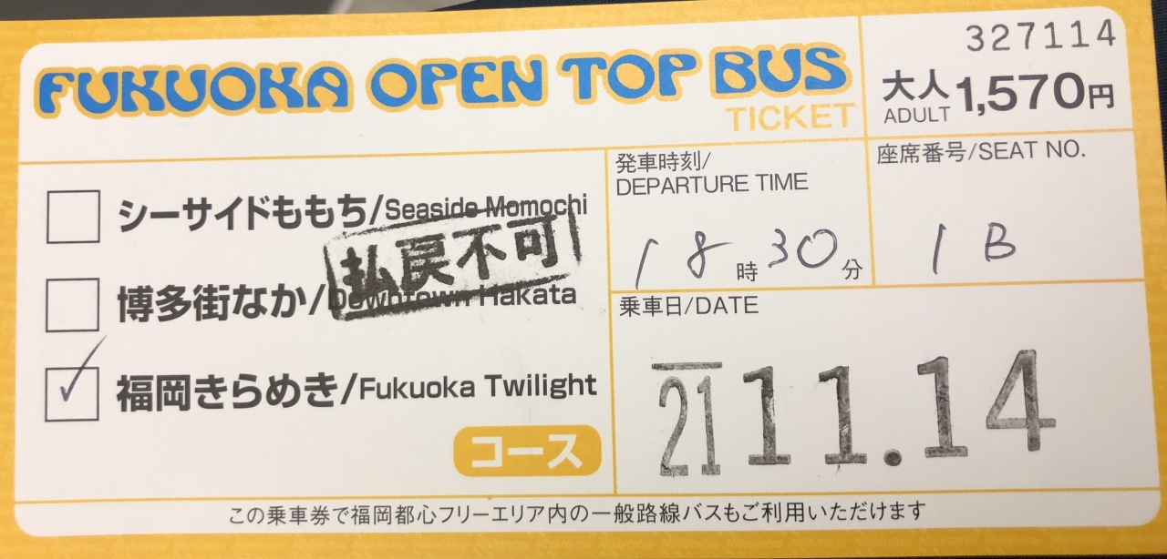 知人を誘って、夜景きらめきコースに乗りました。1570円。このチケットを見せると、市内西鉄バスは無料。レストランによってはプチサービスが付くので、早めの引換がお勧めです。予約が早かったので、最前列。でも眺めは中央から後ろが良いとのことで、ガイドさんが空席を勧めてくれました。高所からの夜景は、イルミネーションも含めて、大変美しかったです。足元に暖房はありますが、屋根がないので、防寒対策はしっかりと。