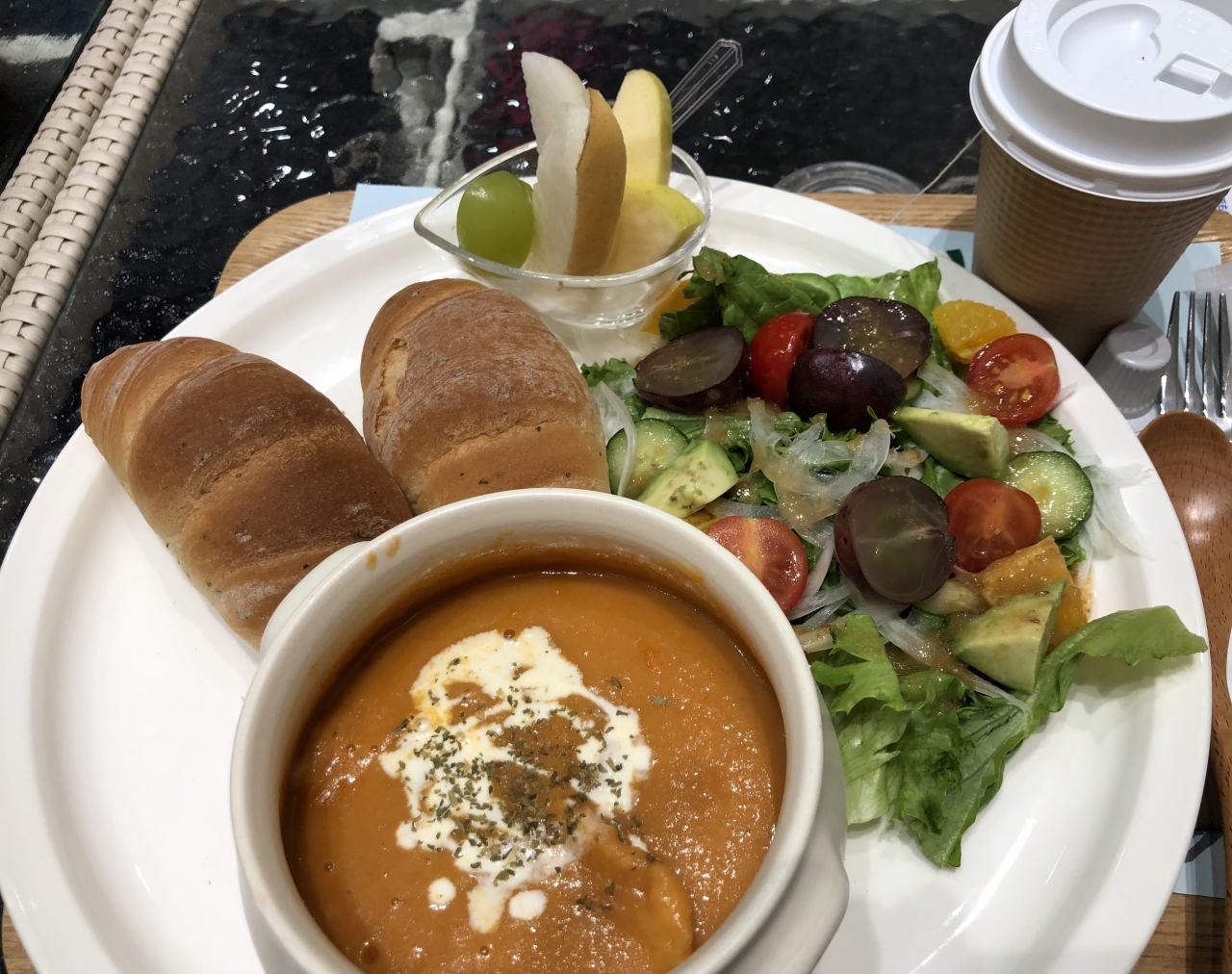 西小倉駅から徒歩5分の、リバーウォークの1階にある果物屋さんです。11月には柿「秋王」といちごのあまおう、12月には「紅まどんな」が店頭に並んでいます。知人とランチをここで。マダムのランチ1320円。ふかふかのパンと、濃厚なトマトスープ、フルーツ入りのサラダ。どれも美味しかったです。