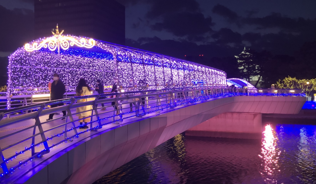 小倉井筒屋と、リバーウォークを結ぶ橋です。昔森鴎外が、小倉のこの近くの、鍛冶町に住んだことがあるということから、名付けられたようです。この時期はイルミネーションが点灯し、青と紫が美しく、人出が多いです。