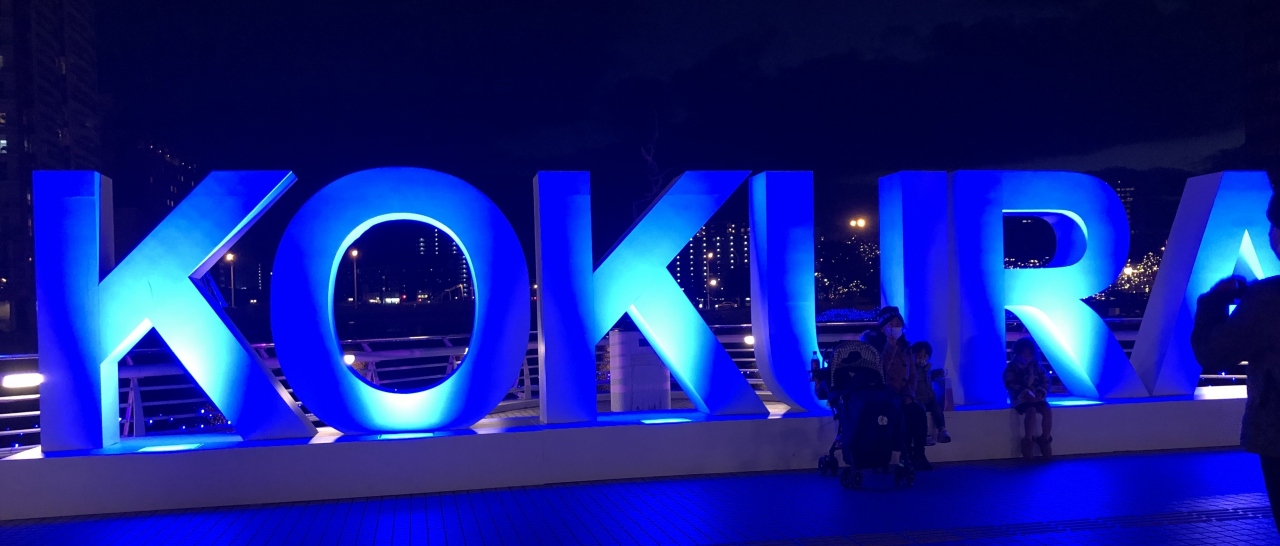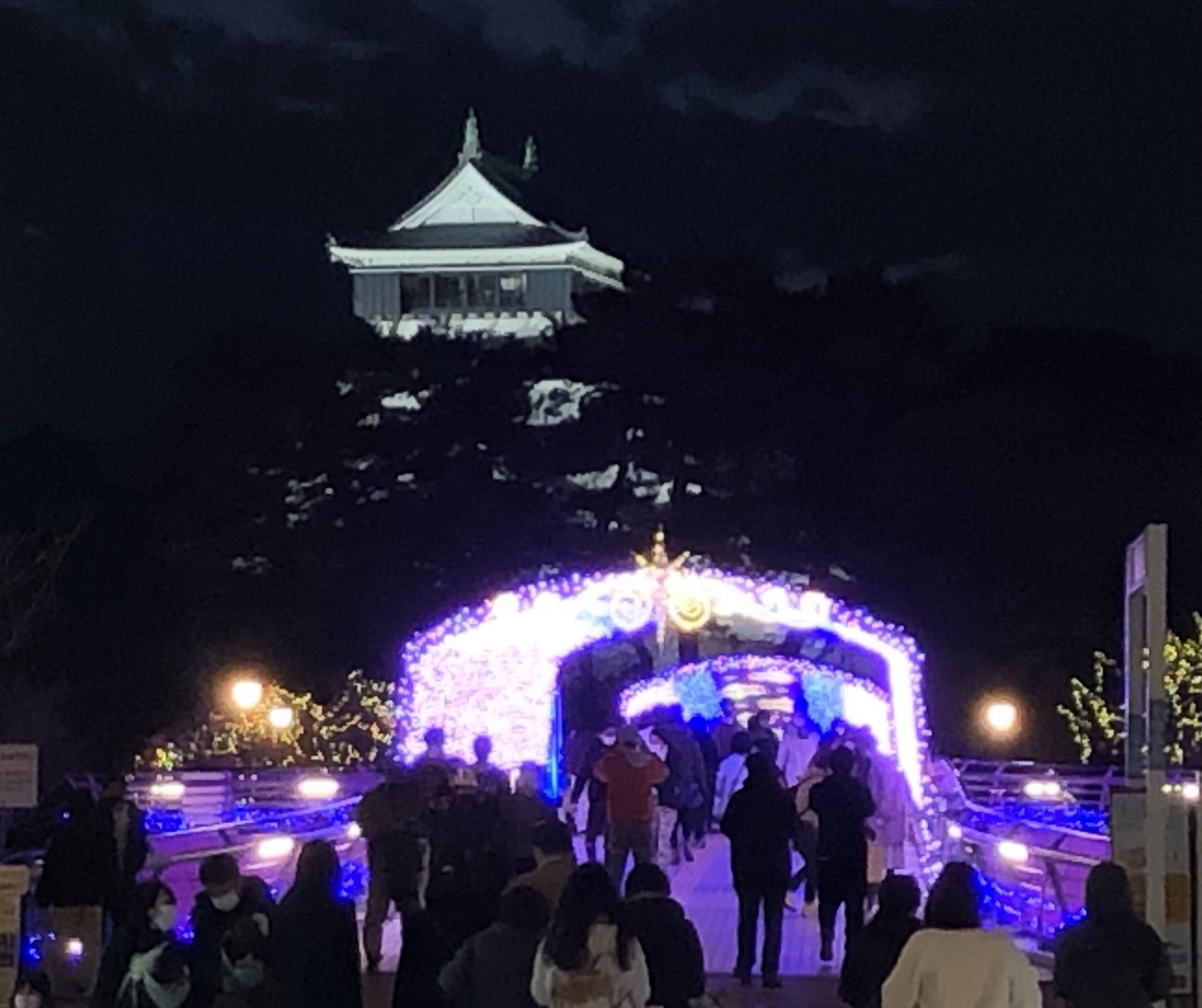 西小倉駅から徒歩8分くらいです。11月中頃から鴎外橋が青紫色にライトアップされています。その明かりもあって、お城が暗闇に白く浮かび上がって見えます。寒い季節ですが、人出が多く、屋台も出ており、にぎやかです。