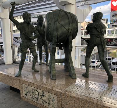 小倉駅のペデストリアンデッキ上にある像です。3人の子供たちが、太鼓を叩いています。例年なら、夏のお祭りの前、街のあちこちから練習する音が聞こえてくるのですが、去年も今年もお祭りはなく、子供たちが可哀そうでした。