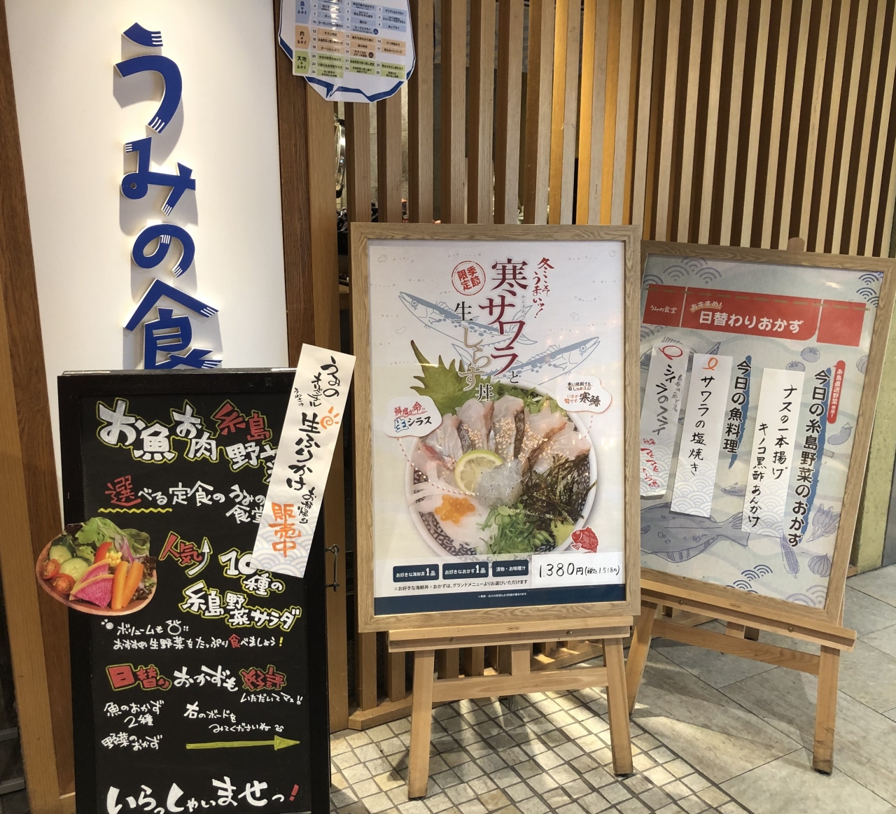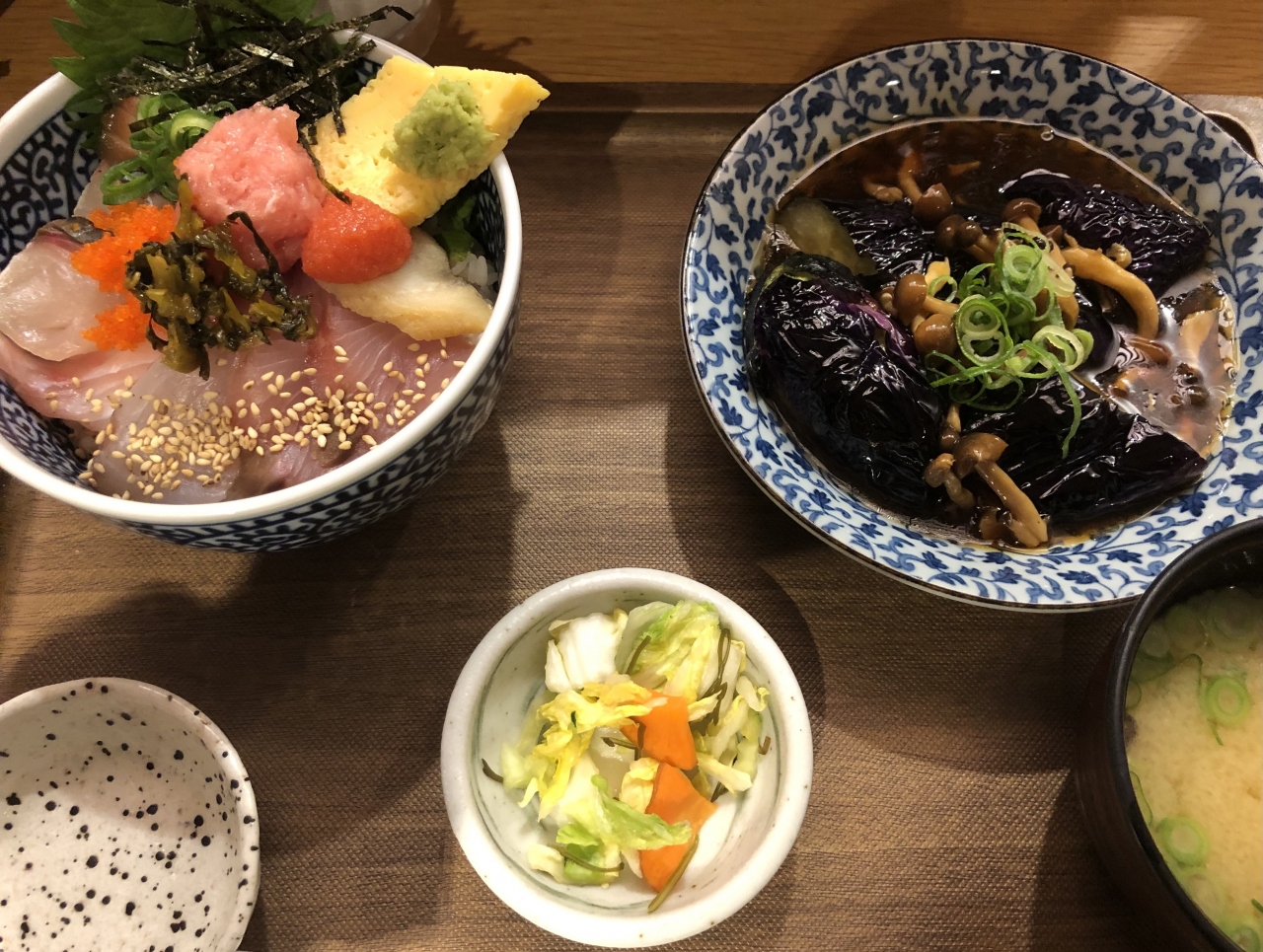 パルコ地下で和食を頂きました。平日13時を過ぎると並ばなくても入れます。魚や肉、野菜料理から選んで組み合わせることができます。テーブルにミニトマトのへたがあったので、拭き直しを頼んで、カウンターに着席。海鮮丼に穴子やねぎとろの入った「うみの丼」をプラス220円で。刺身は新鮮で美味。ナスの一本揚げも熱々で美味。1730円。