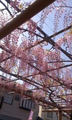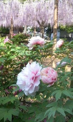 曼陀羅寺公園は醍醐天の勅願により建てられた由緒正しいお寺で、茅葺きの堂々とした門と本堂の他、幾つもの塔頭寺院も周囲にある。何よりも有名なのは境内に植えられた藤の花。様々な品種の藤が回廊を作っている。今はちょうど早咲きの藤が見頃を迎えている。薄紫の他白やピンクの花もあった。花房が長く垂れるノダフジはこれから連休後半にかけて見頃となりそう。その藤の足元にこれも見事な牡丹が植えられており、色とりどりの大輪の花を咲かせていた。清楚な藤と華麗な牡丹の両方が一度に楽しめる。