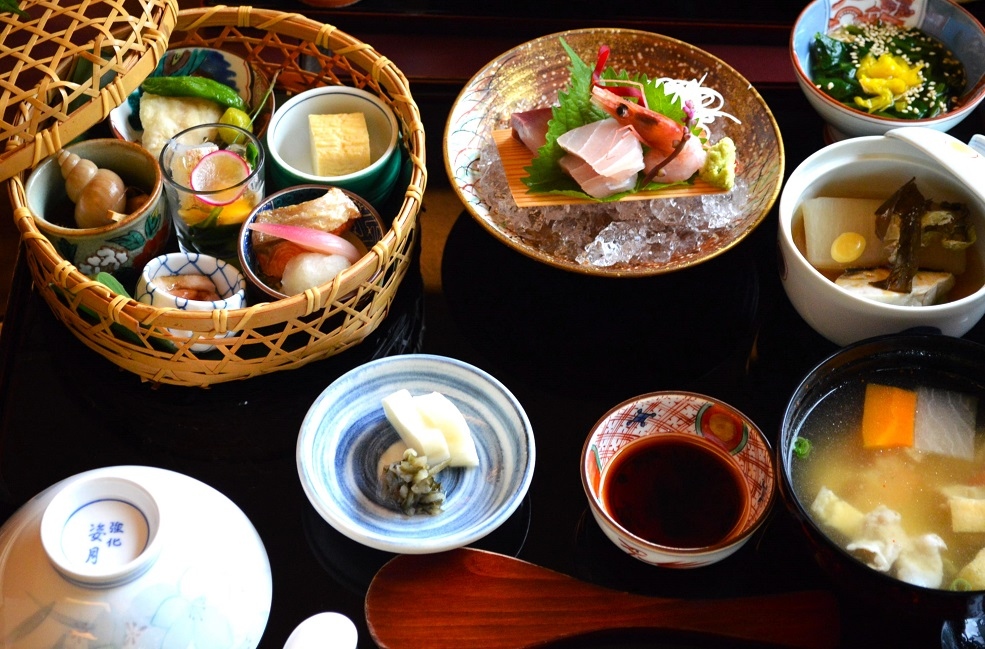 「旬の恵みと炊き立て土鍋御飯昼御膳」は全体の量が控えめながらもお昼としては丁度よく、篭盛りとお造りを中心に見た目も充実した布陣だった。