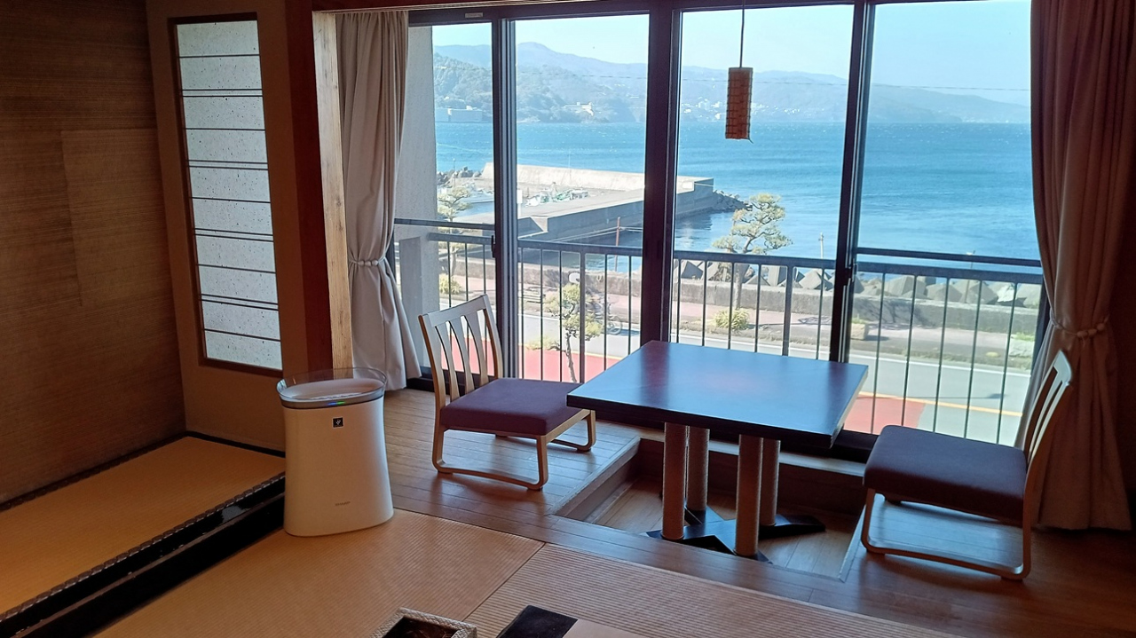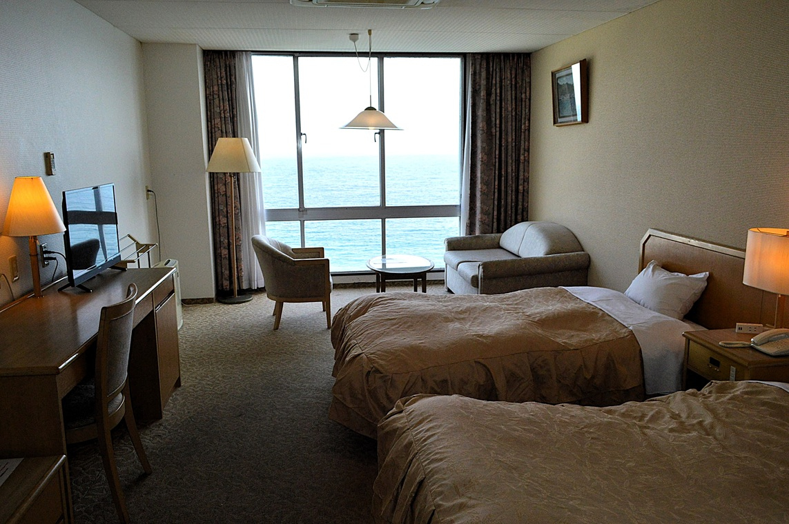 部屋は清潔で劣化も見当たらず、朝から夕方まで海の景色の変化を見ていられる。