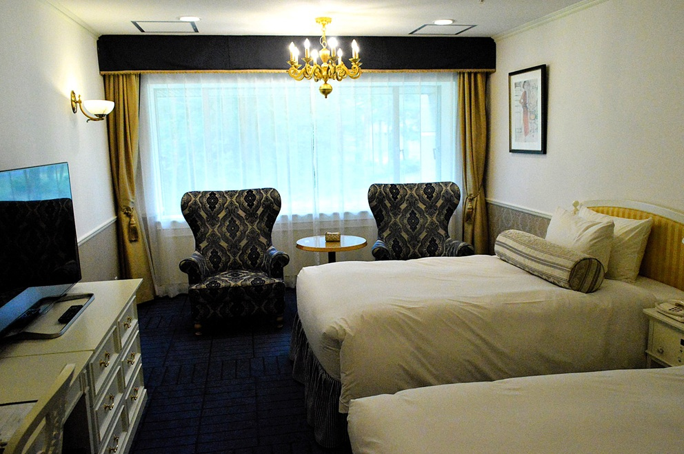 ツインの部屋には何とシャンデリアがあり一人用の大きな椅子が2脚置かれてリッチな気分にさせてくれた。