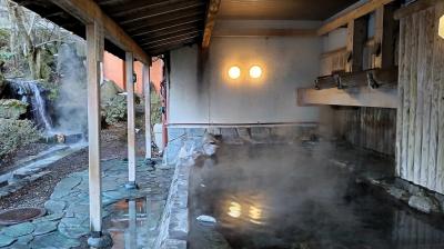 渡り廊下の先の温泉大浴場は硫黄の臭いのする乳白色の湯でいかにも効き目がありそうだ。そのお湯は何と12km奥の湯元温泉の源泉をひきこんでいる。