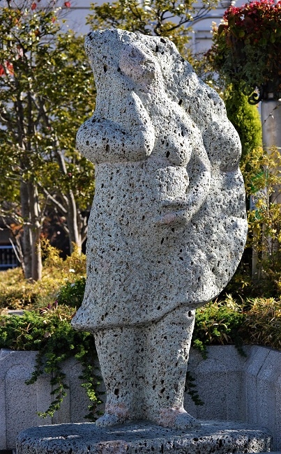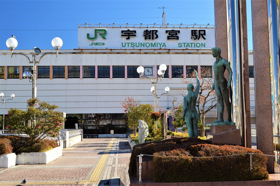 JR宇都宮駅西口ペデストリアンデッキに設置された高さ1.6メートル、重さ1.7トンある大谷石の彫刻で駅舎を背景に立っている。
