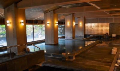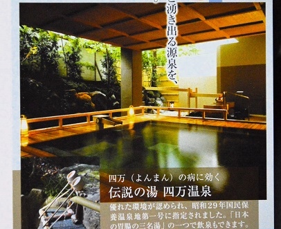 大浴場の片方が休止で残念だったが展望浴場で四万温泉の源泉かけ流しを満喫できた。