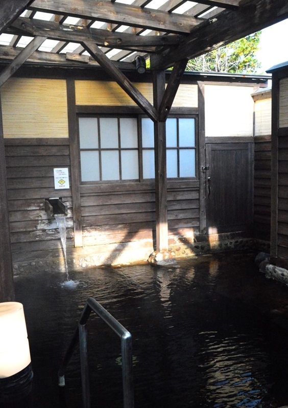 また別棟にやや熱い足湯もあり、飲泉の湧出口で温泉卵や燗酒も楽しめた。
