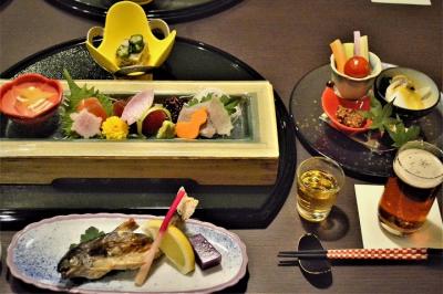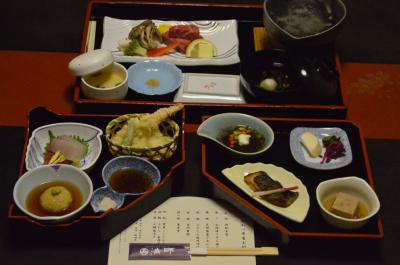 「光雲コース」の夕食は個別の食事処(椅子席)で料理が順番に運ばれてゆっくり味わうことができるのは正に至福。