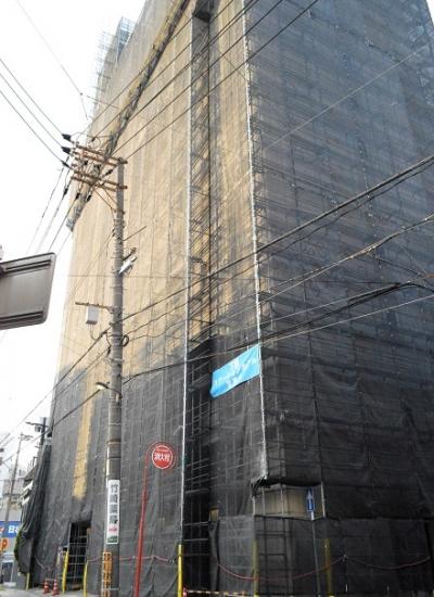当日は外装工事で建物が黒く覆われ看板だけが頼りだった。