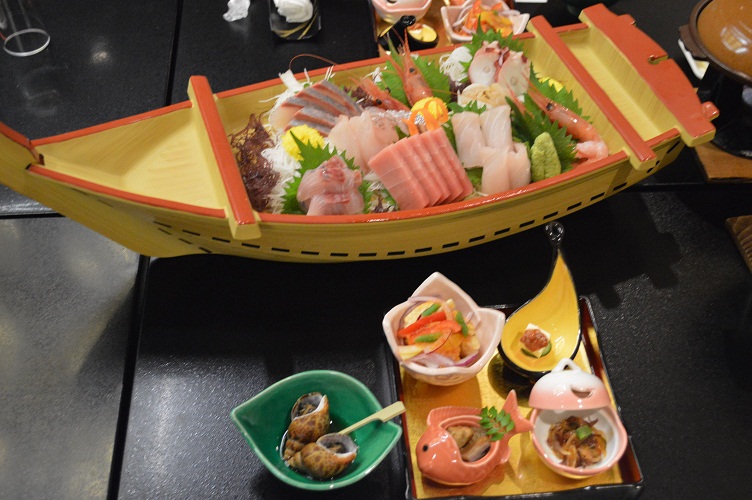 料理は一人一艘の舟盛で海の幸中心の品ぞろえであり、「口福」感に浸ることができた。