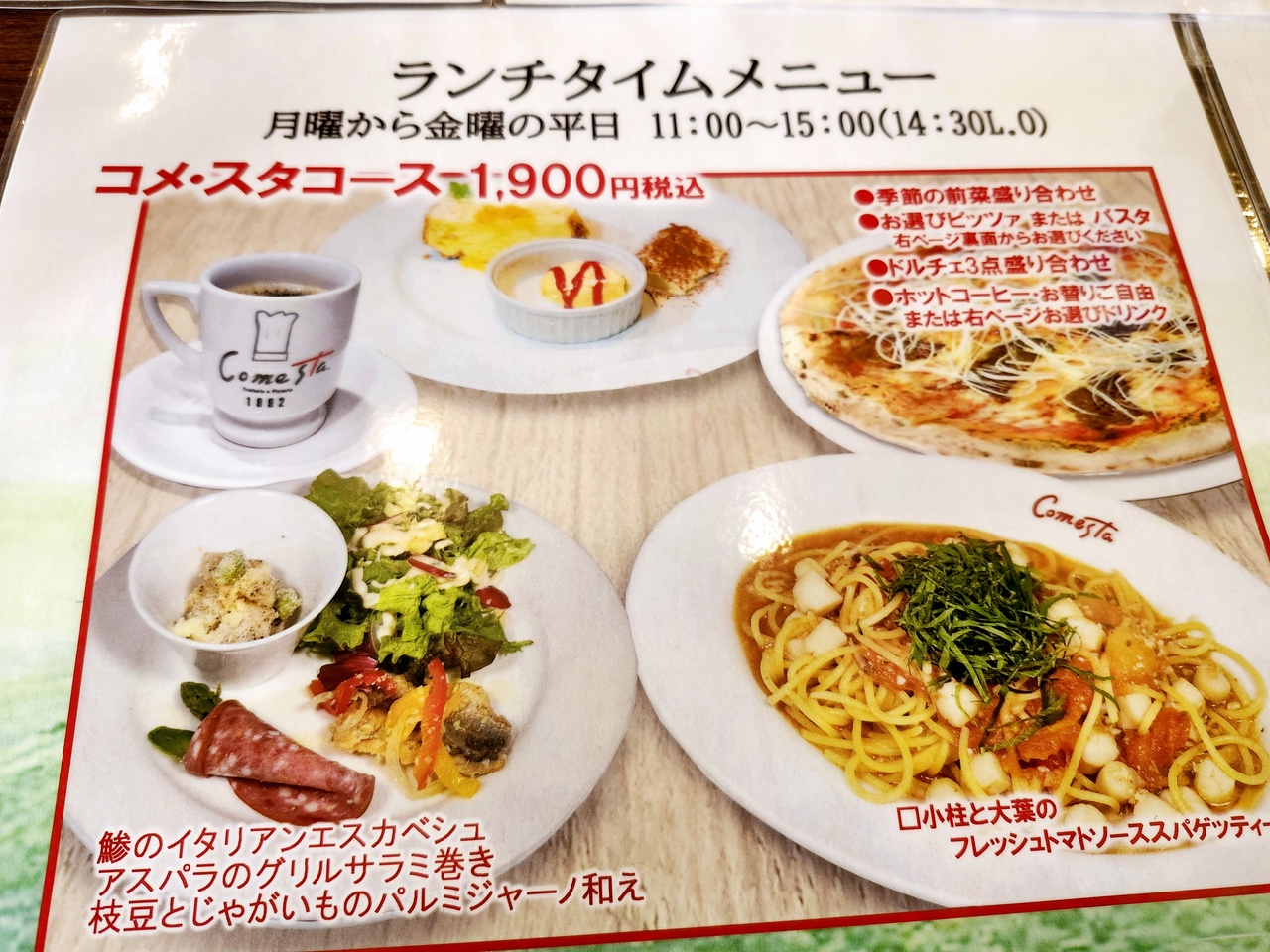 ピッツァが美味しいと聞いて前から行ってみたかったコメ・スタ本店です。ランチタイムのコメスタコースを友人とシェアして味わいました。ピッツァはモチモチのナポリタイプとパリパリのローマタイプのハーフ&ハーフも選べます。前菜は鯵のイタリアンエスカベシュ・アスパラのグリルサラミ巻き・枝豆とジャガイモのパルミジャーノ和えと充実していました。