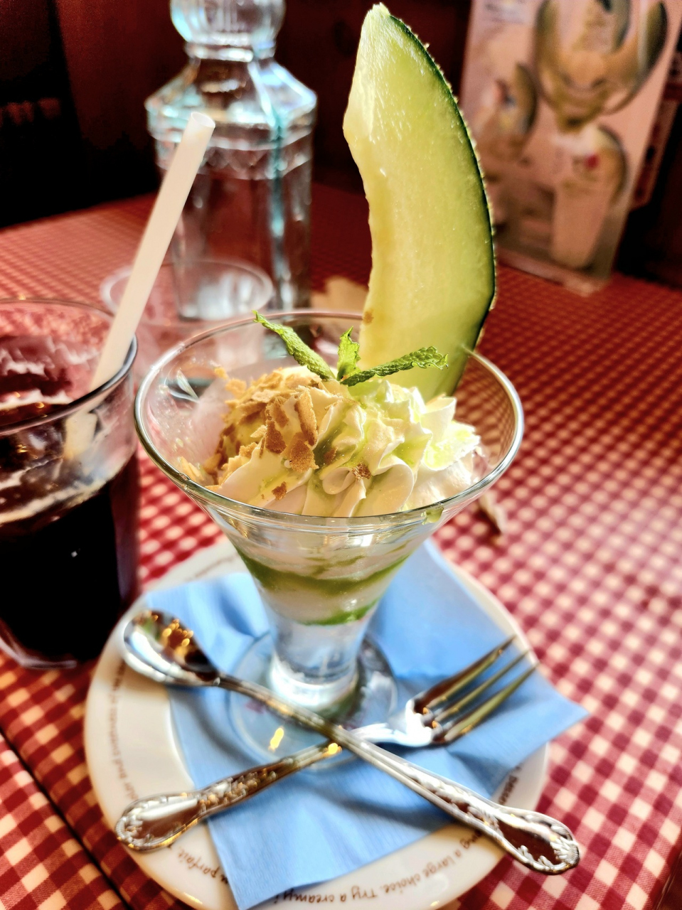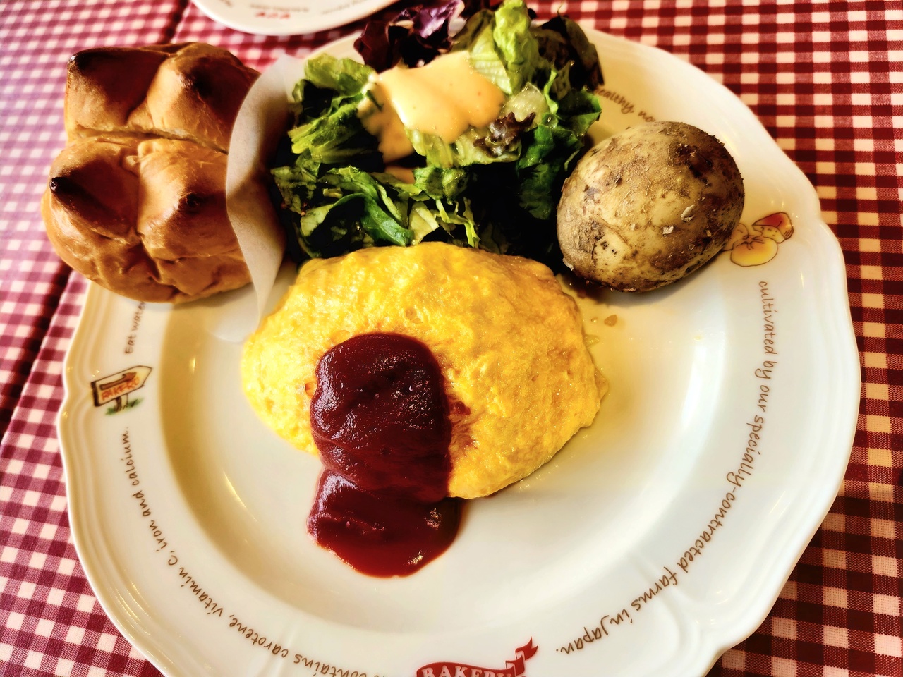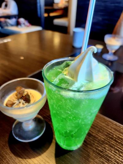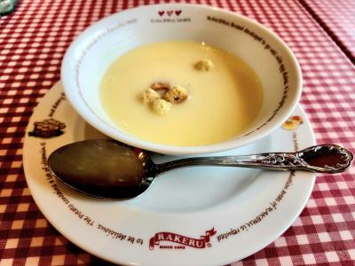 RAKERUの人気ナンバー1メニューのKUKUモッツァレラチーズオムレツのスープ・ドリンク・デザートを満喫して来ました。デザートは100円プラスして本日のデザート〈メロンのサンデー〉にしました。ふわふわの〈RAKERUパン〉も付いていて満腹でした。