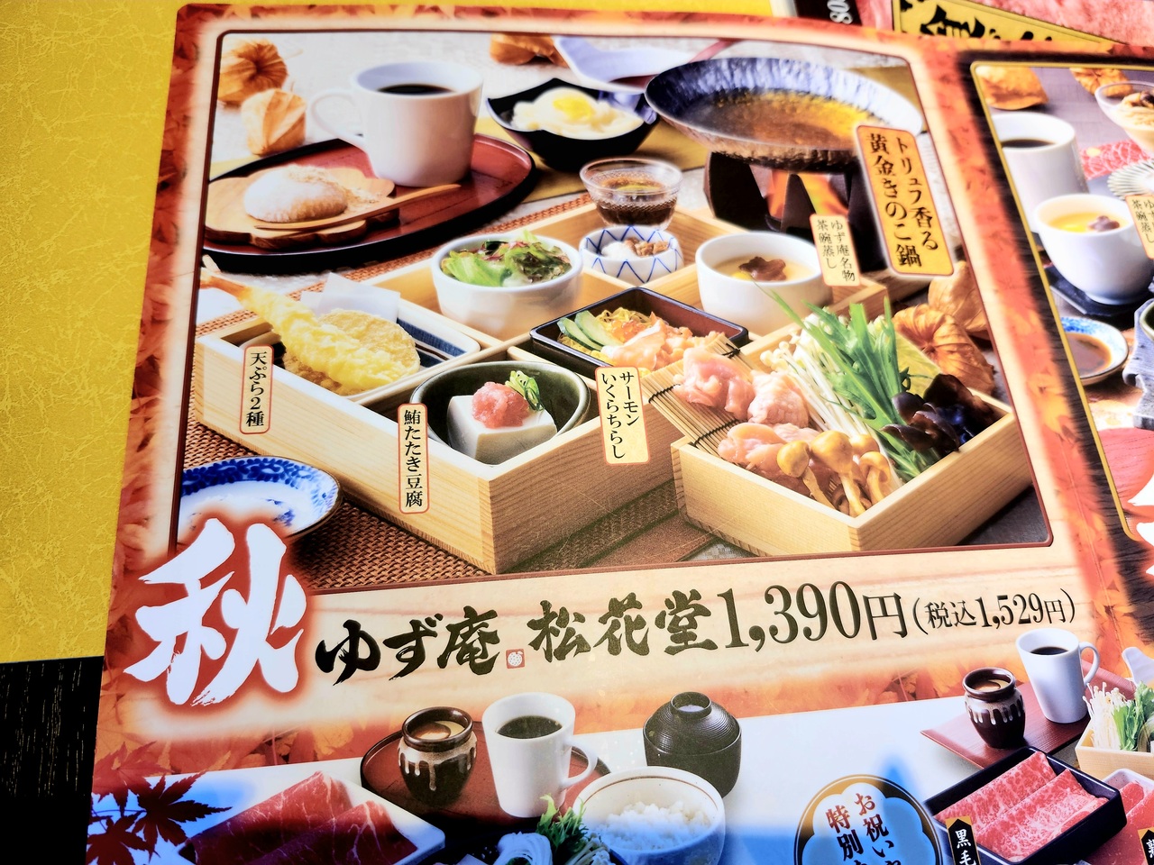 上旬・下旬に友人と2回程利用しました。ランチは『秋ゆず庵松花堂』ディナーは『しゃぶしゃぶセット』を味わいました。ランチは『きのこ鍋』や『サーモンいくら寿司』がディナーは『握り寿司』や『2種類のスープ』が美味しかったです。
