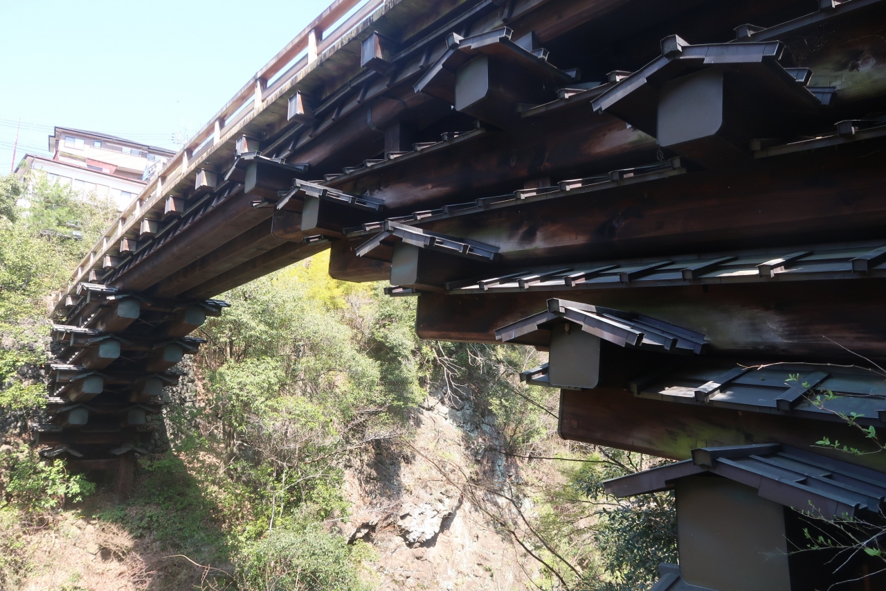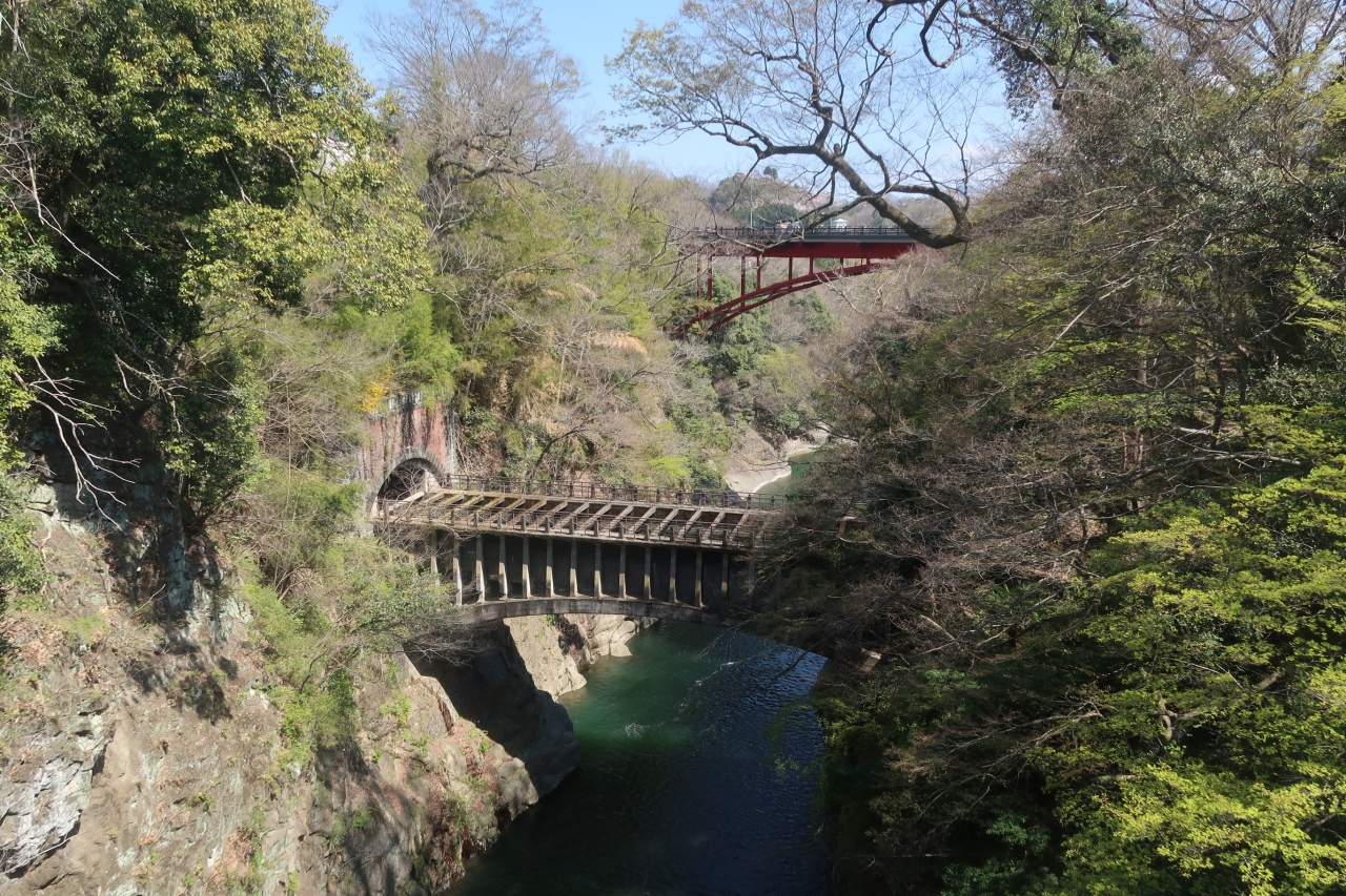 日本三奇橋のひとつ猿橋の眼下に架かる鉄橋のようなものは日本初の水力発電所で利用するために架けられた水路橋で国の重要文化財に指定されています。東京電力の管理地なので外観見学のみとなりますが猿橋を訪れた際はお見逃しなく。