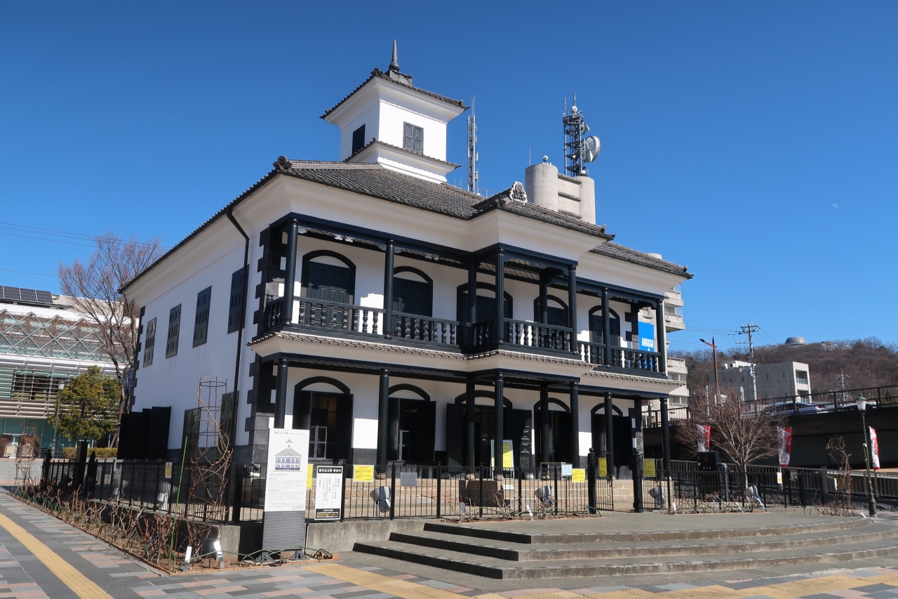 甲府駅北口広場に建つ擬洋風建築の藤村記念館は明治8年に旧睦沢村(現在の甲斐市亀沢)に建てられた旧睦沢学校校舎で国の重要文化財。以前は武田神社の境内にあったそうで現在は甲府駅北口広場に移転し交流施設として活用されてます。