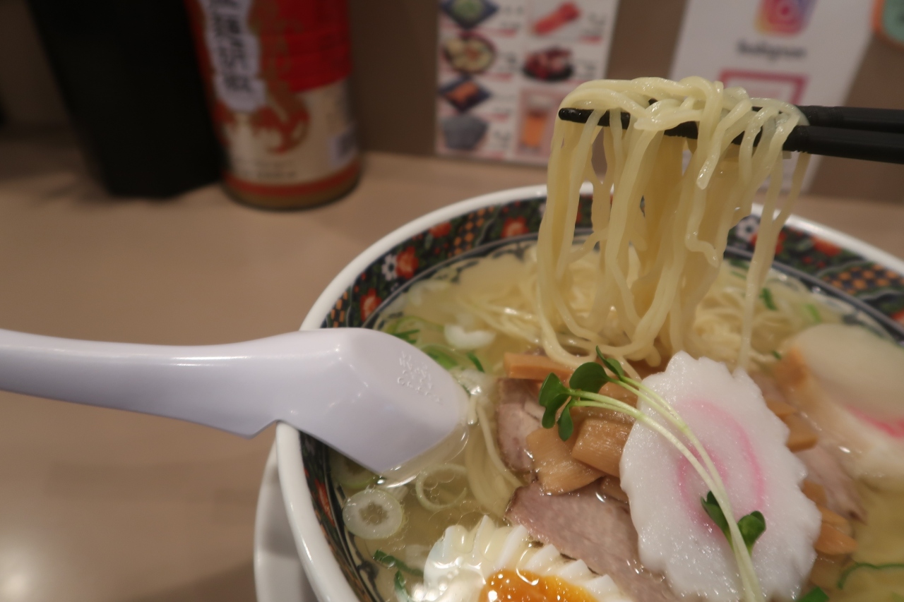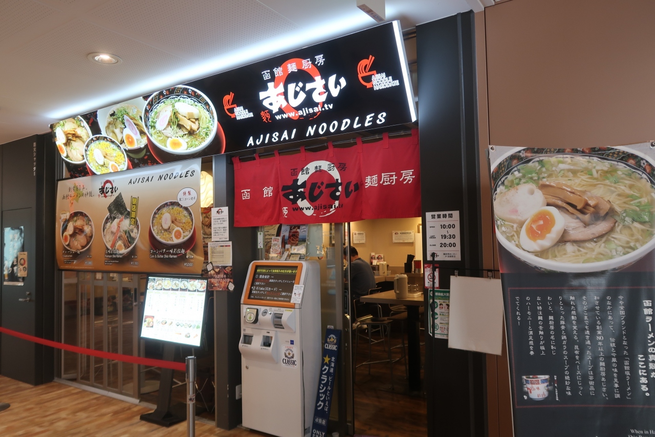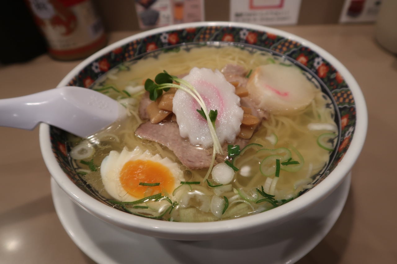 五稜郭タワー前の本店が定休日だったので函館駅店を利用。函館駅の2階という抜群のアクセスです。オーダーは食券制で今回も味彩塩拉麺(750円)をチョイス。具材はチャーシュー、メンマ、ナルト、麩、玉子、ネギ。クリアなスープはあっさりながらもコクのある味わいでストレート麺に良く合ってます。