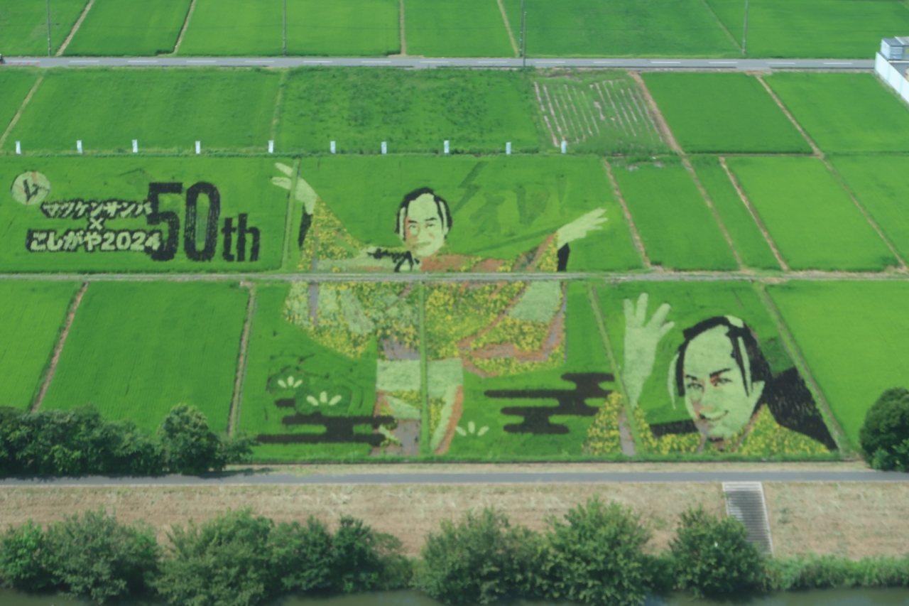 2010年から始まった越谷の田んぼアート。15回目となる今年は「越谷から元気を発信!」がコンセプト。能登半島地震の復興を願い人々を元気づけたいと、2024年のデザインはマツケンサンバです。ちなみに松平健さんは今年が芸能生活50周年なんですって。無料開放している東埼玉資源環境組合第一工場の展望台(高さ80m)から360度の眺望と越谷の街並みが一望できますよ。