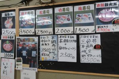 青森駅前の複合施設アウガ地下1階の新鮮市場内にお店があり早朝から営業しているので青森を訪れた際によく利用しています。入口にある手書きのメニューを見るだけで食欲がそそられるんです。今回は旬を求めて大間産本マグロの鉄火丼をオーダー。おおっ、ガリの下に中トロが隠れてました!翌日は新物のイクラと共に・・・おかわり