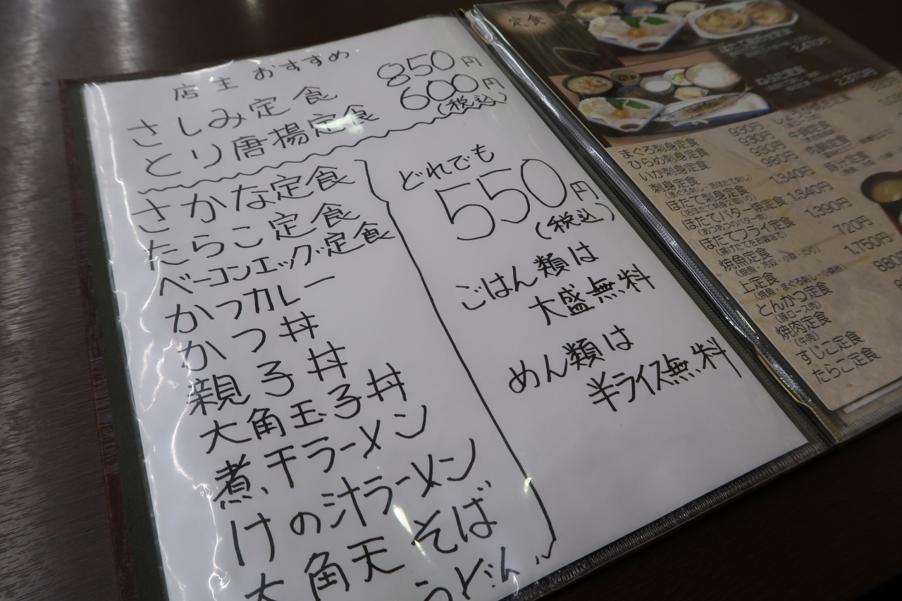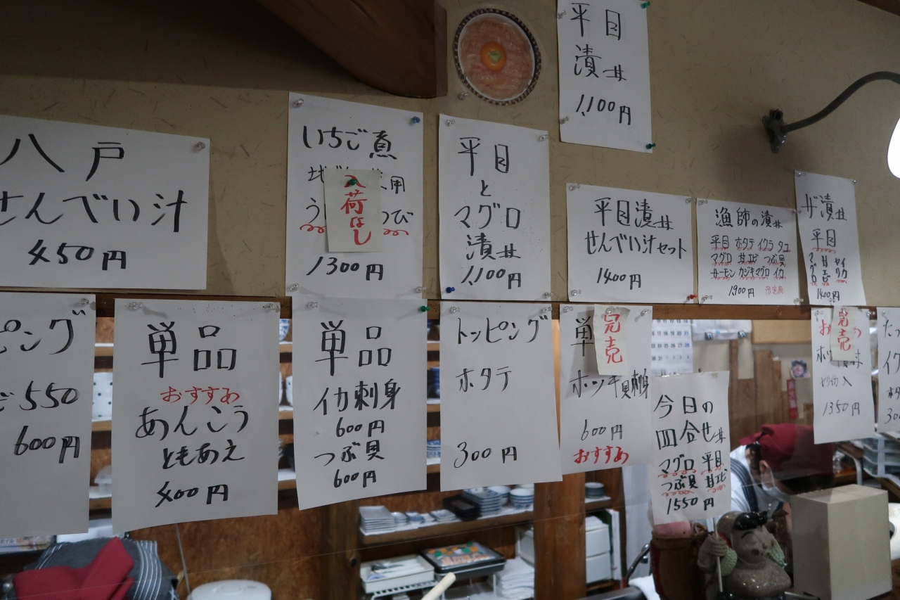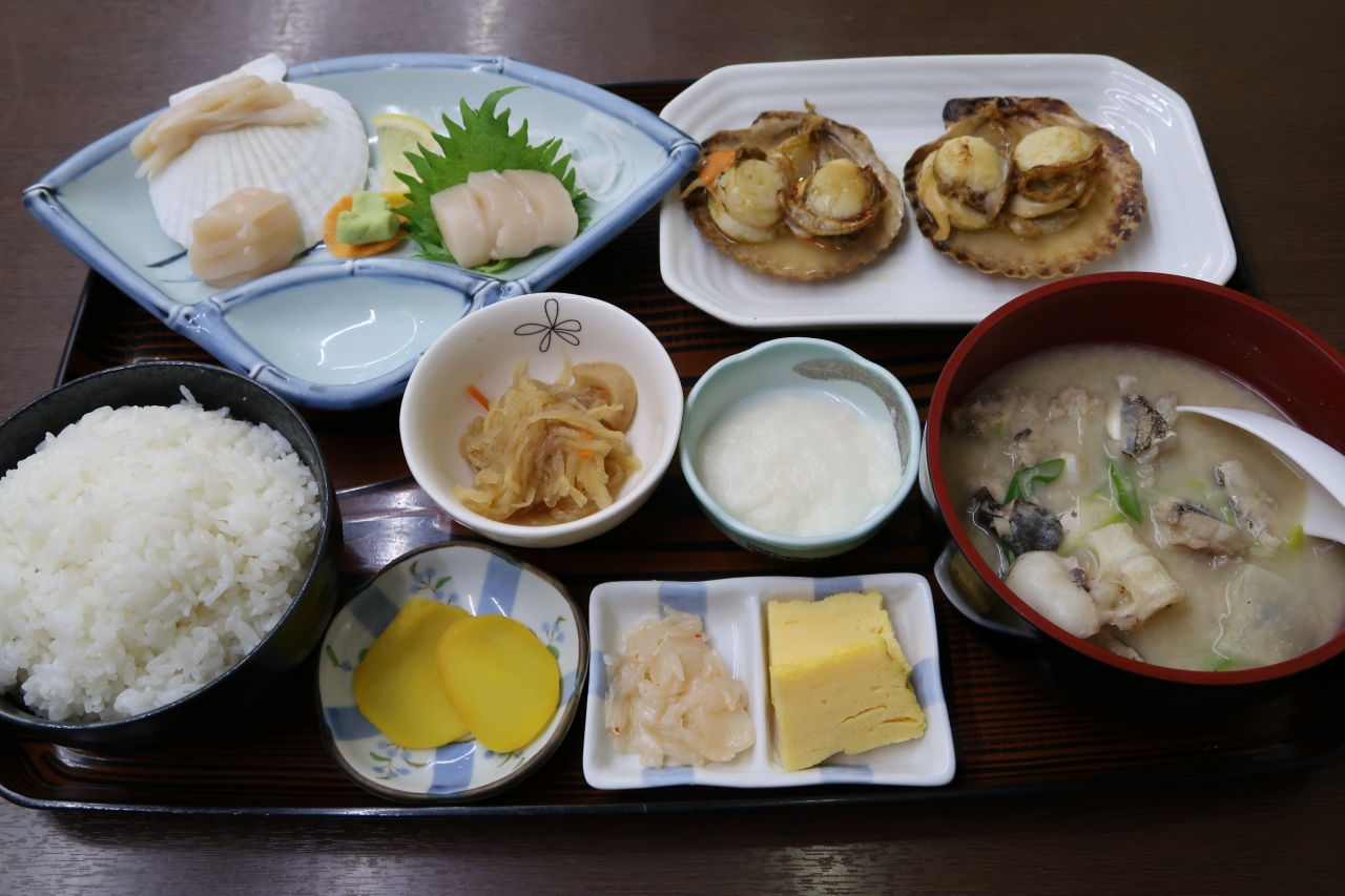 青森の郷土料理を気軽に楽しめる駅前の食堂です。半年ぶりに訪れた青森駅は雪の中。この時期に味わえる鱈のじゃっぱ汁を求めてお邪魔しました。何度も食べてるホタテの刺身とバター焼きがセットになった「ホタテ組み合わせ定食」に味噌汁をじゃっぱ汁に変更。メニューを見てみると500円定食が550円になってたり値上げの波は青森にも…