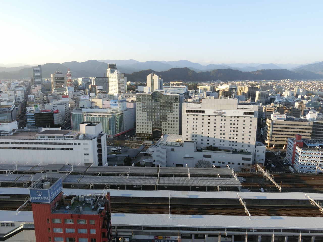 JR静岡駅の南口からデッキで直結している高層ホテルです。全室が18階以上なのでどの部屋からも静岡市街の眺望が楽しめます。今回は26平米のダブルを予約して新幹線と在来線のトレインビューを楽しみながら過ごしてきました。周辺には飲食店や居酒屋もありますが館内のレストランも充実してますよ。